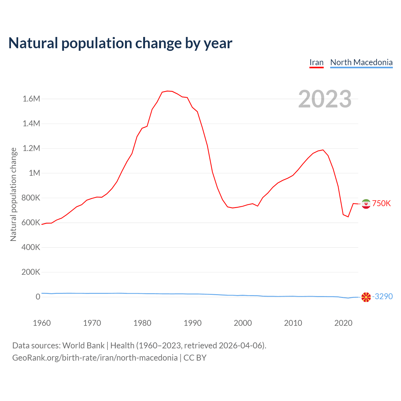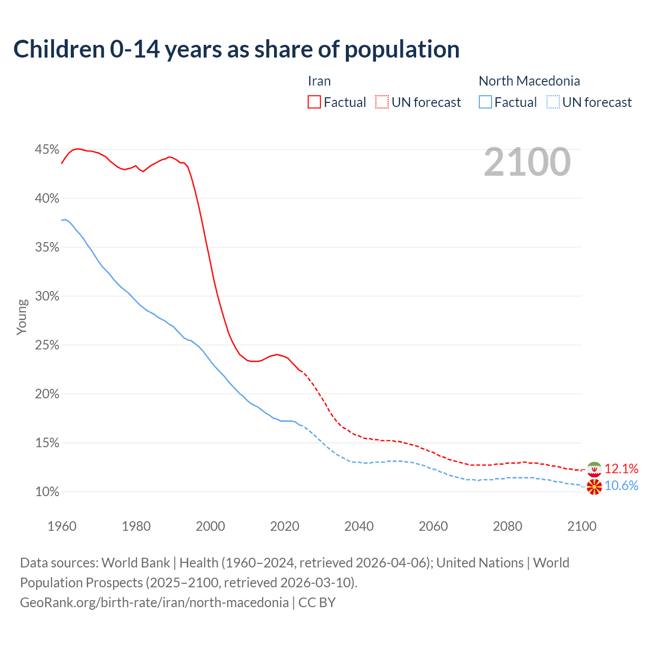 Iran has an annual birth rate of 13 births per 1,000 people, compared to 9.2 for North Macedonia. The average number of children a woman is expected to have during her lifetime — the fertility rate, is 1.7 in Iran and 1.5 in North Macedonia — 11.5% difference.