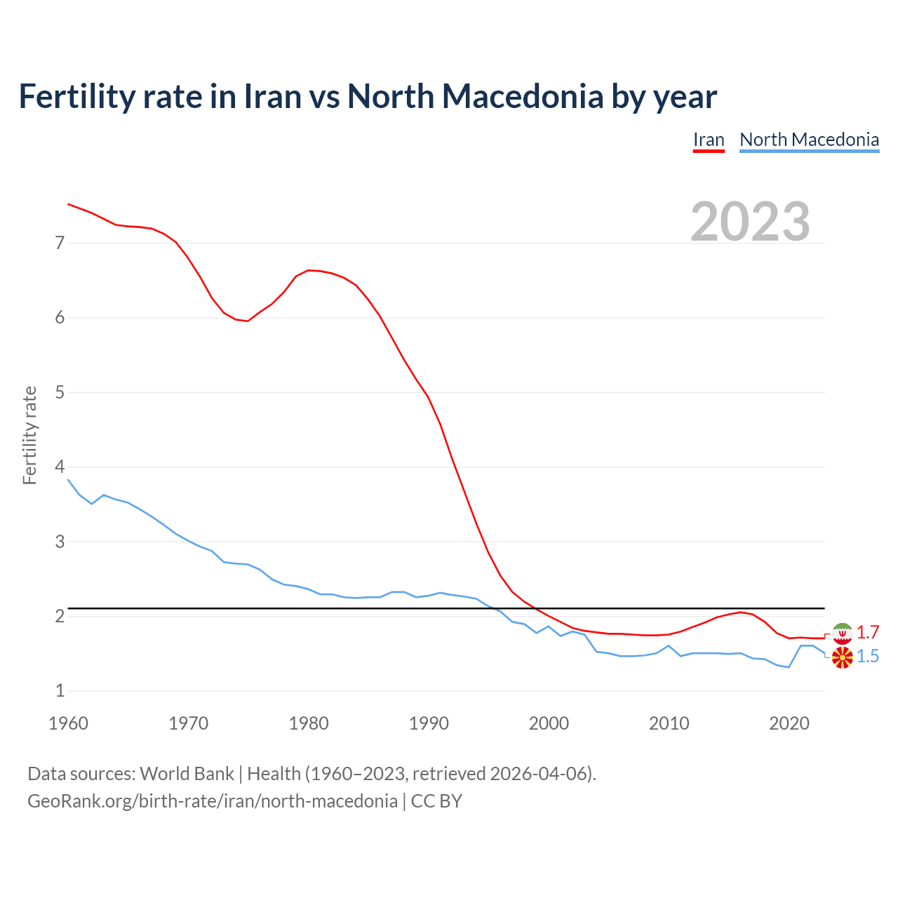 According to the latest available data on birth rates, the fertility rate in Iran was 1.7 children per woman in 2023, compared to 1.5 in North Macedonia in 2023. The replacement level is considered to be 2.1 children per woman.