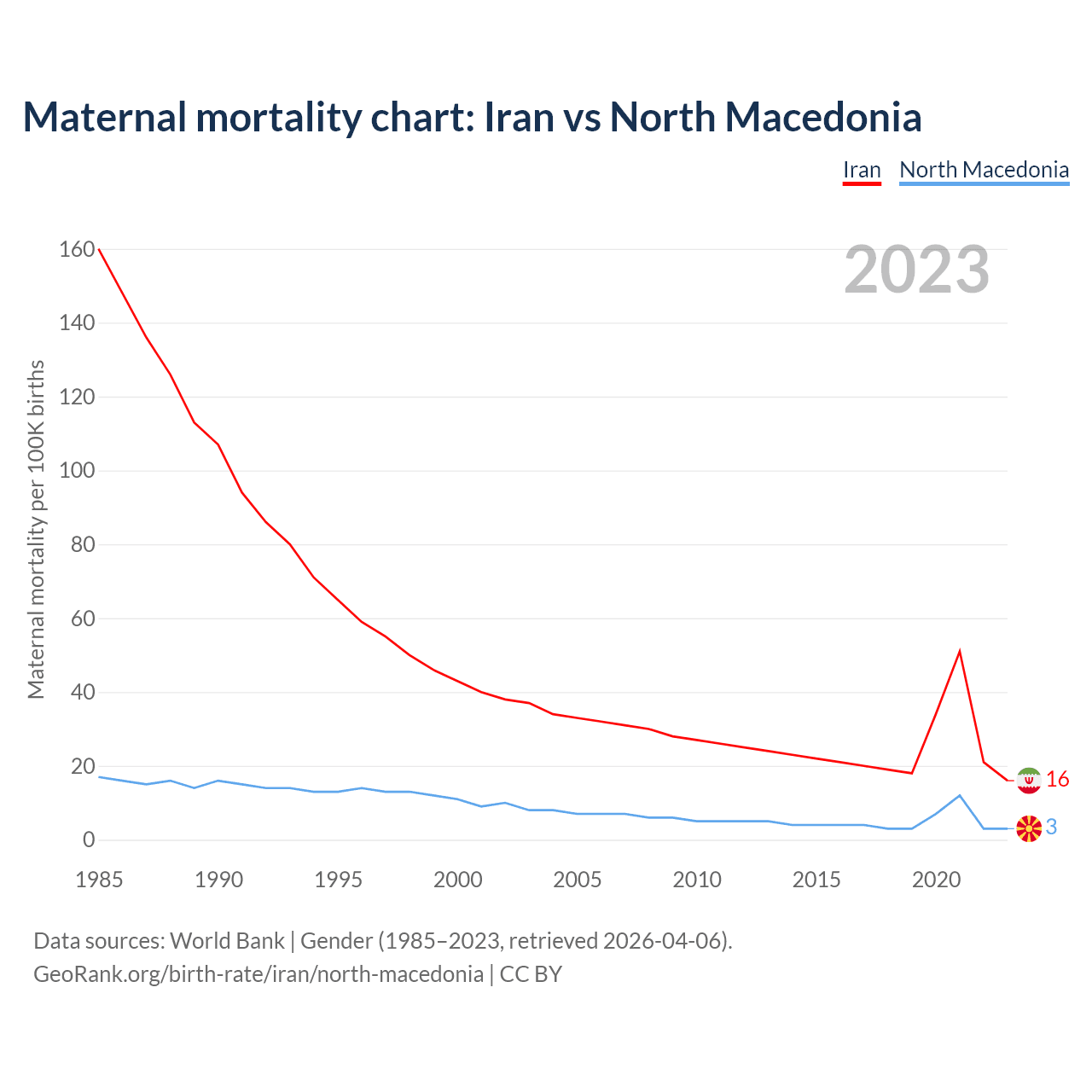 The maternal mortality rate, which is the probability of dying during childbirth or within 42 days of pregnancy termination, is 16 deaths per 100,000 live births in Iran, compared to 3 deaths in North Macedonia.