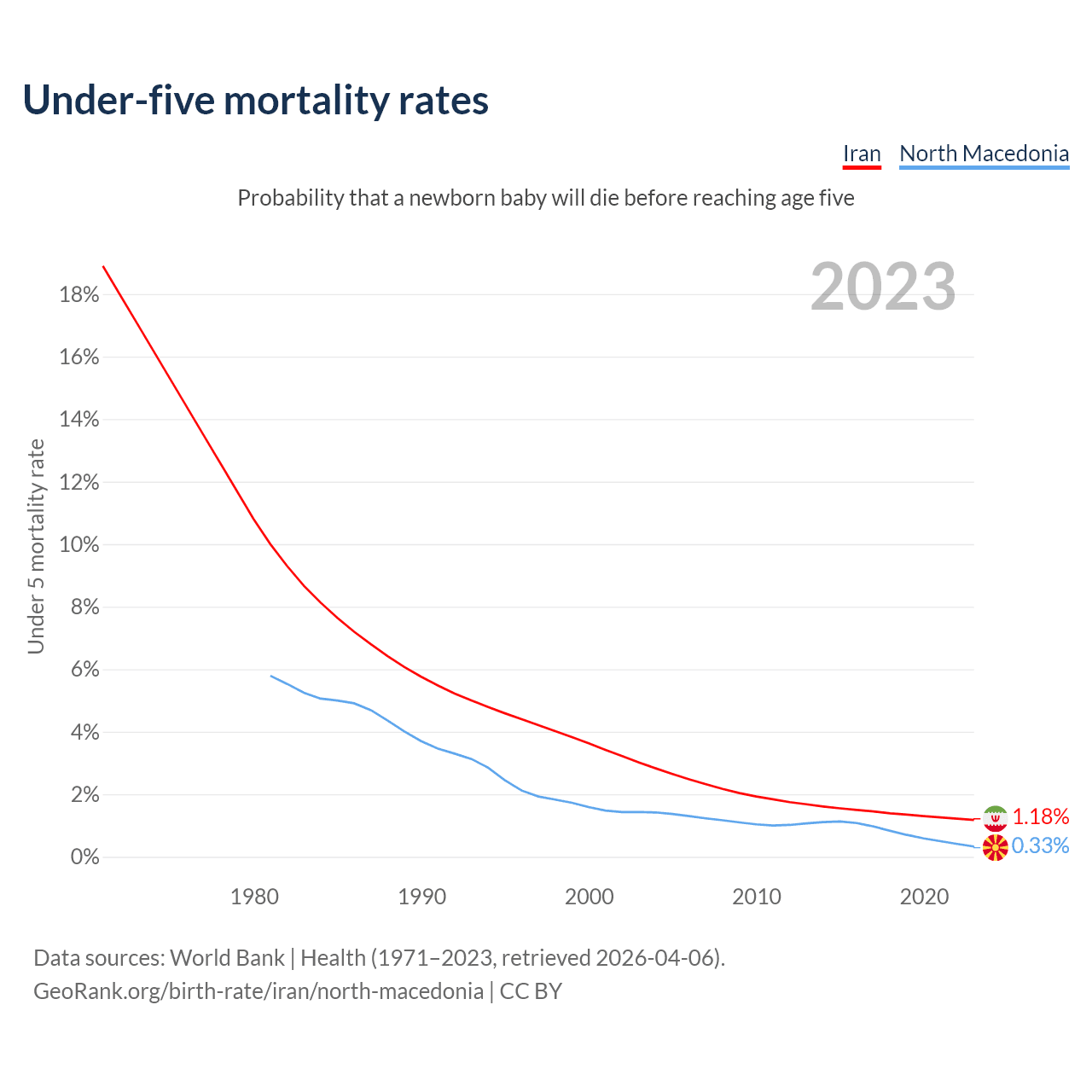 The chance that a newborn baby will die before reaching age five is 1.18% in Iran and 0.33% in North Macedonia. Above is a chart with historical data on under-five mortality rates.