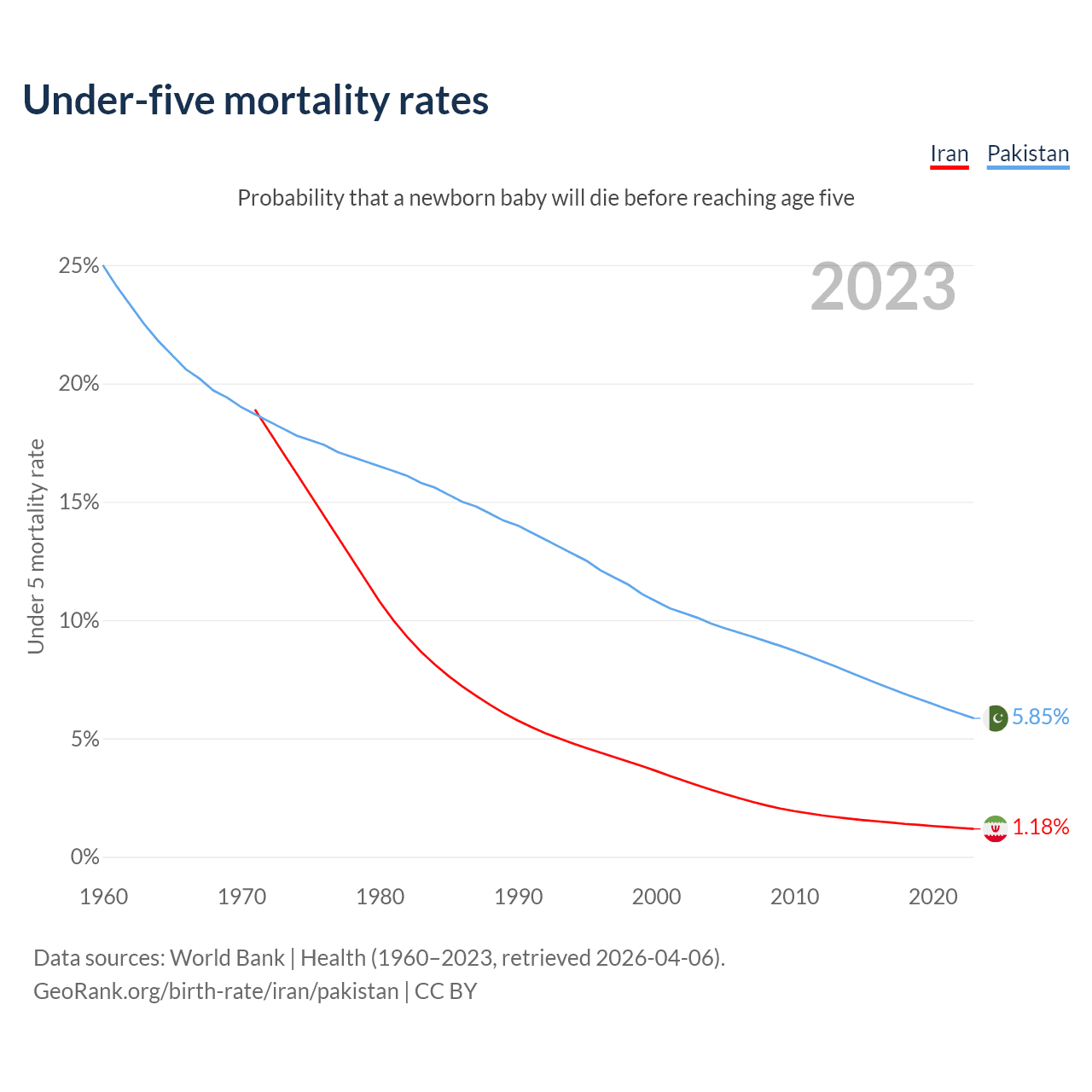 The chance that a newborn baby will die before reaching age five is 1.18% in Iran and 5.85% in Pakistan. Above is a chart with historical data on under-five mortality rates.