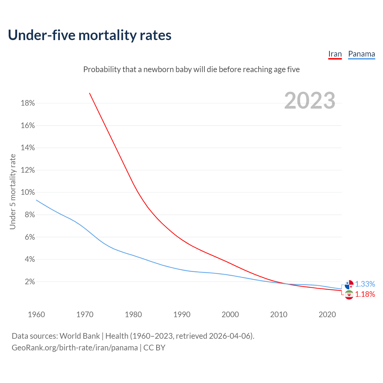 The chance that a newborn baby will die before reaching age five is 1.18% in Iran and 1.33% in Panama. Above is a chart with historical data on under-five mortality rates.