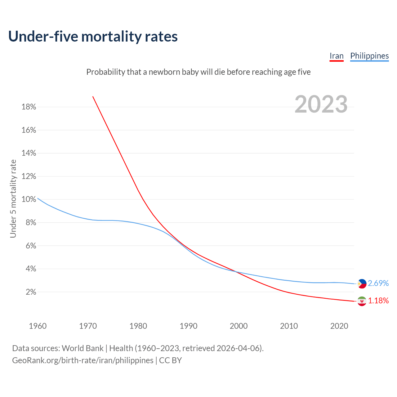 The chance that a newborn baby will die before reaching age five is 1.18% in Iran and 2.69% in the Philippines. Above is a chart with historical data on under-five mortality rates.
