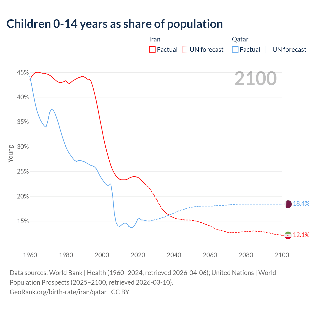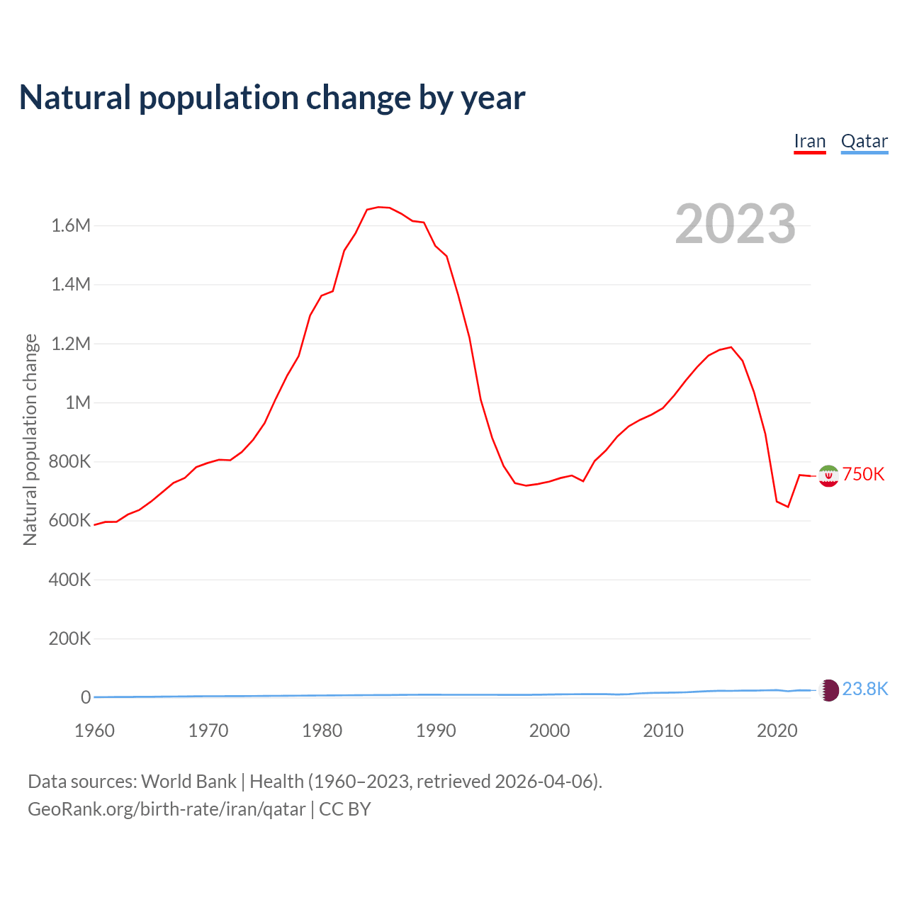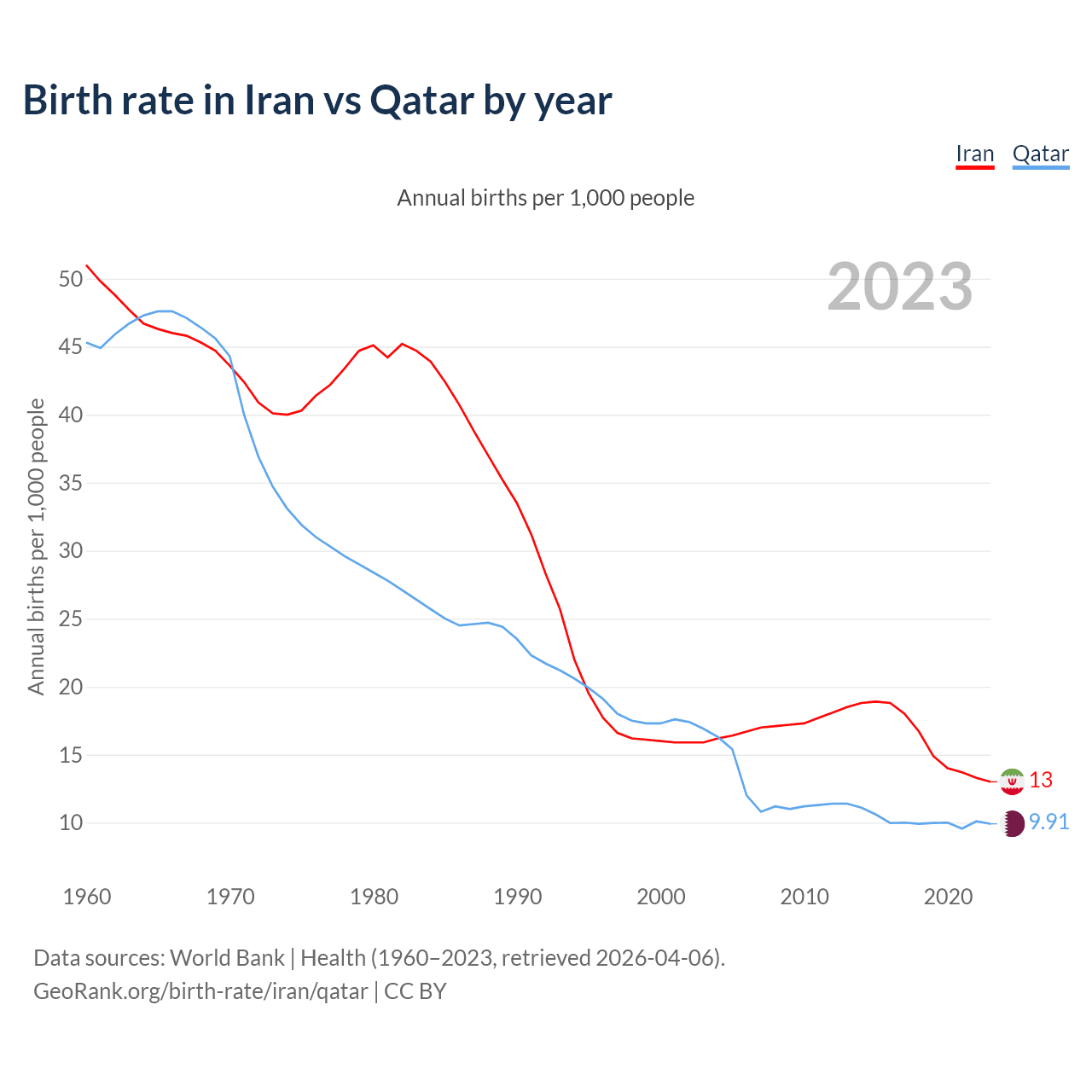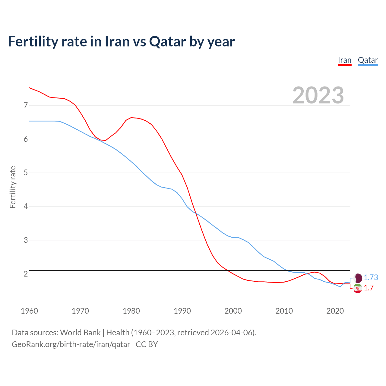Iran has an annual birth rate of 13 births per 1,000 people, compared to 9.91 for Qatar. The average number of children a woman is expected to have during her lifetime — the fertility rate, is 1.7 in Iran and 1.73 in Qatar — 2.01% difference.