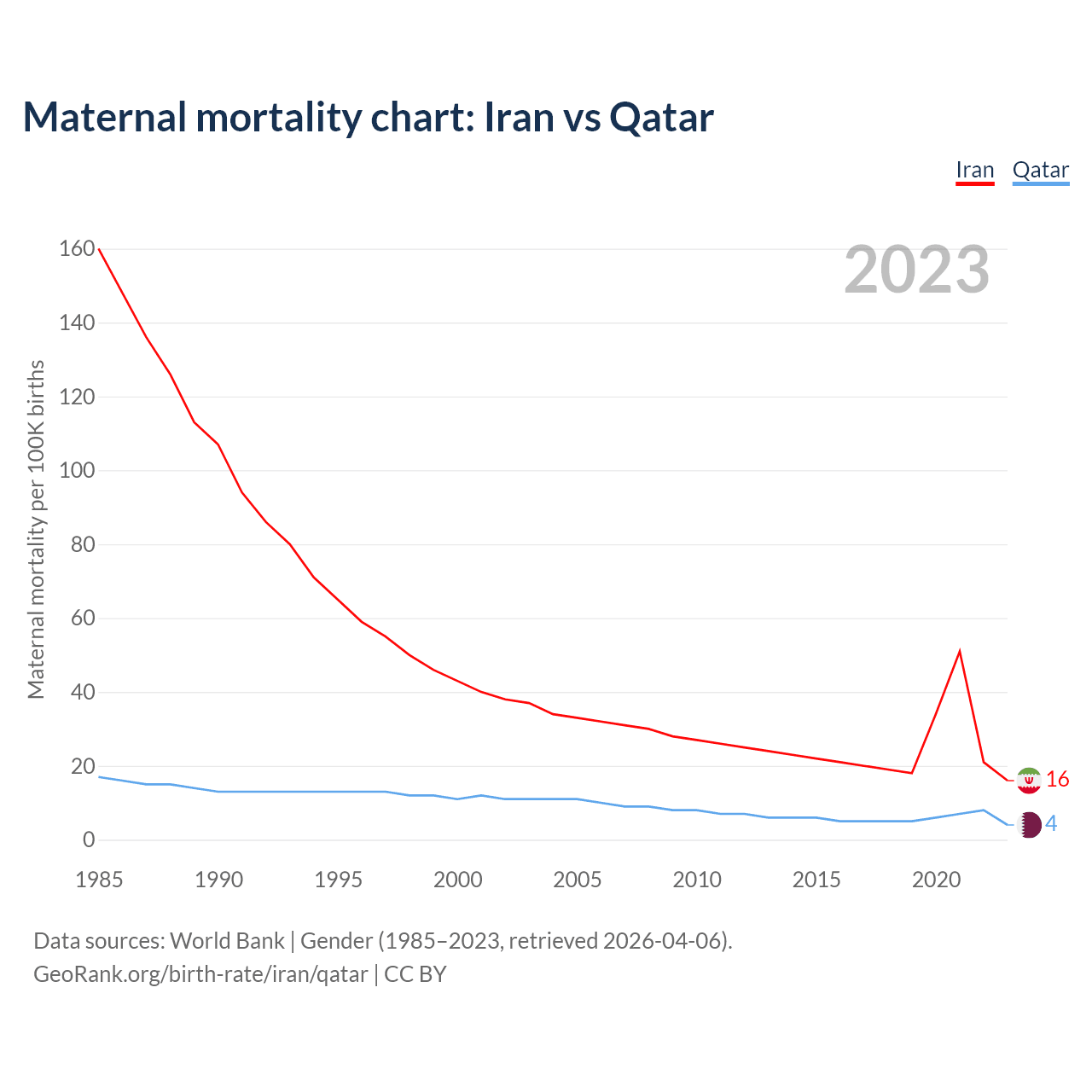 The maternal mortality rate, which is the probability of dying during childbirth or within 42 days of pregnancy termination, is 16 deaths per 100,000 live births in Iran, compared to 4 deaths in Qatar.