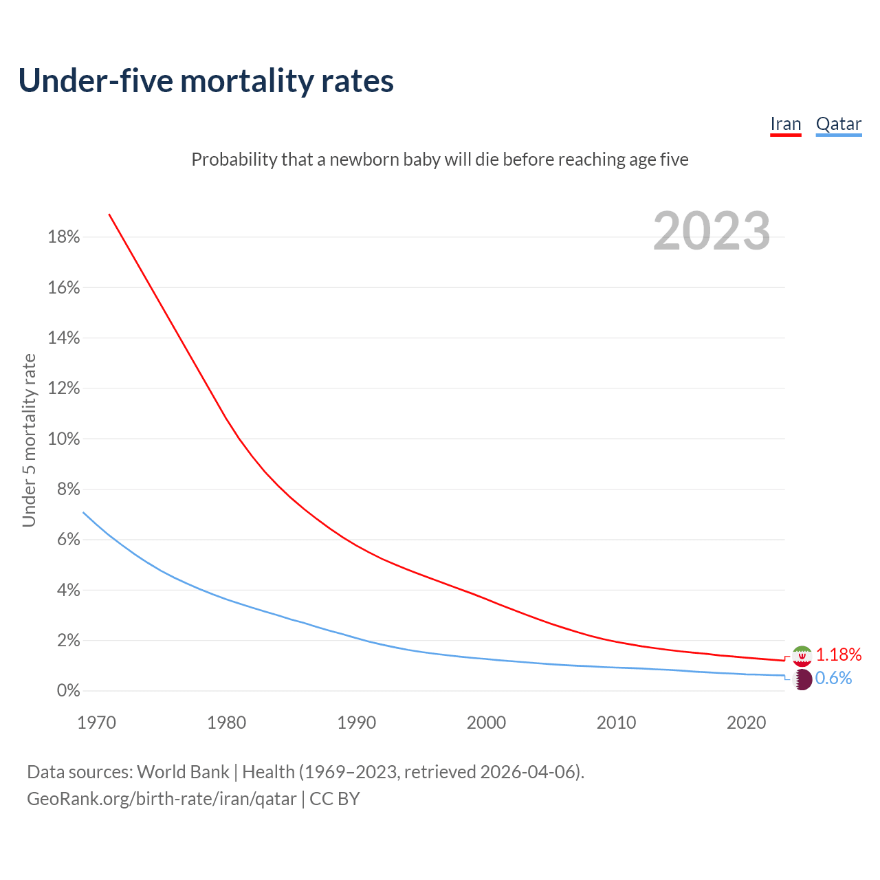 The chance that a newborn baby will die before reaching age five is 1.18% in Iran and 0.6% in Qatar. Above is a chart with historical data on under-five mortality rates.