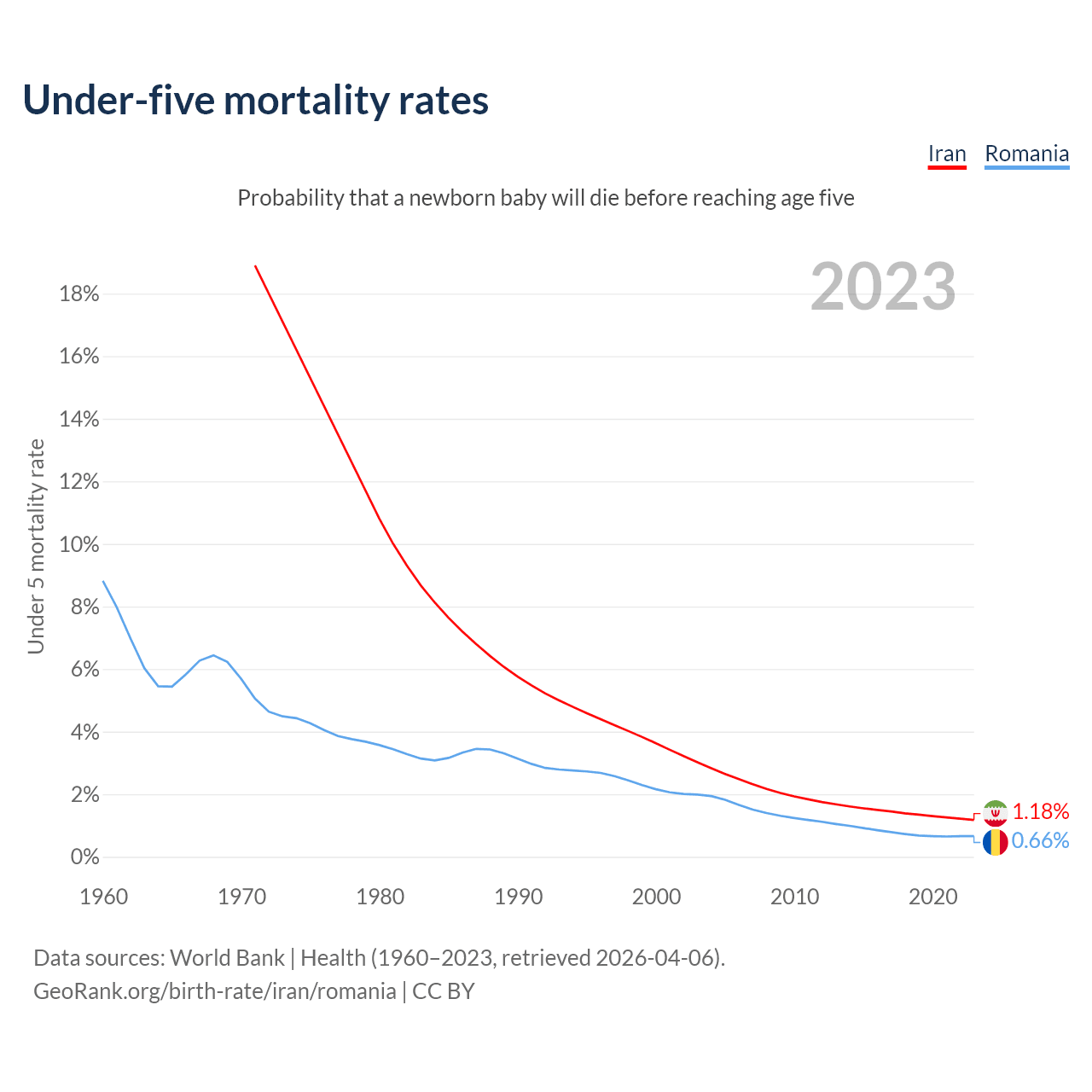 The chance that a newborn baby will die before reaching age five is 1.18% in Iran and 0.66% in Romania. Above is a chart with historical data on under-five mortality rates.