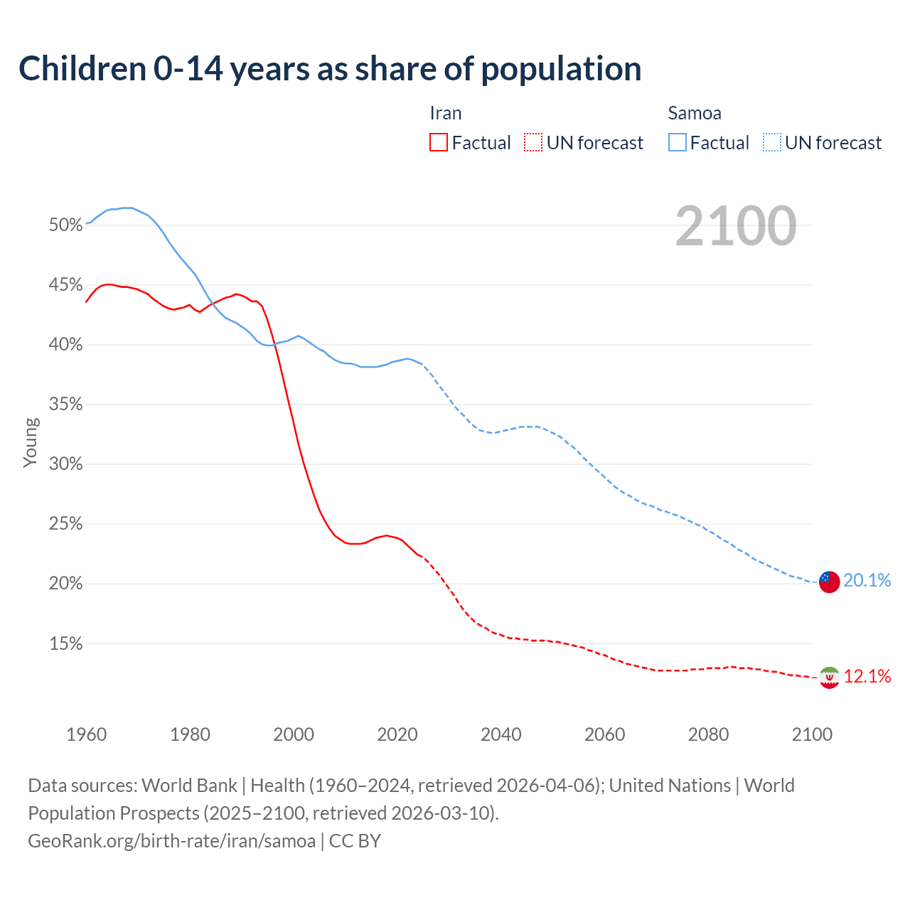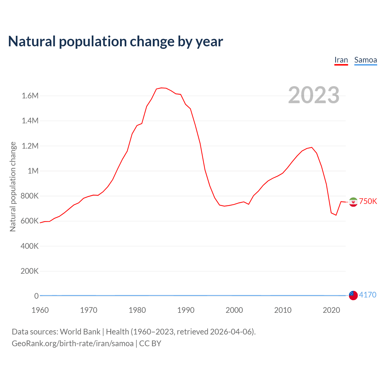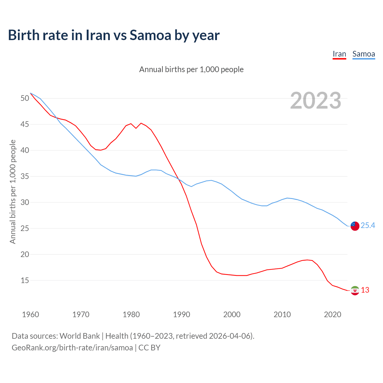 Iran has an annual birth rate of 13 births per 1,000 people, compared to 25.4 for Samoa. The average number of children a woman is expected to have during her lifetime — the fertility rate, is 1.7 in Iran and 3.83 in Samoa — 125.9% difference.