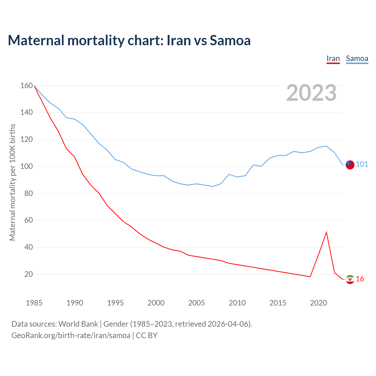 The maternal mortality rate, which is the probability of dying during childbirth or within 42 days of pregnancy termination, is 16 deaths per 100,000 live births in Iran, compared to 101 deaths in Samoa.