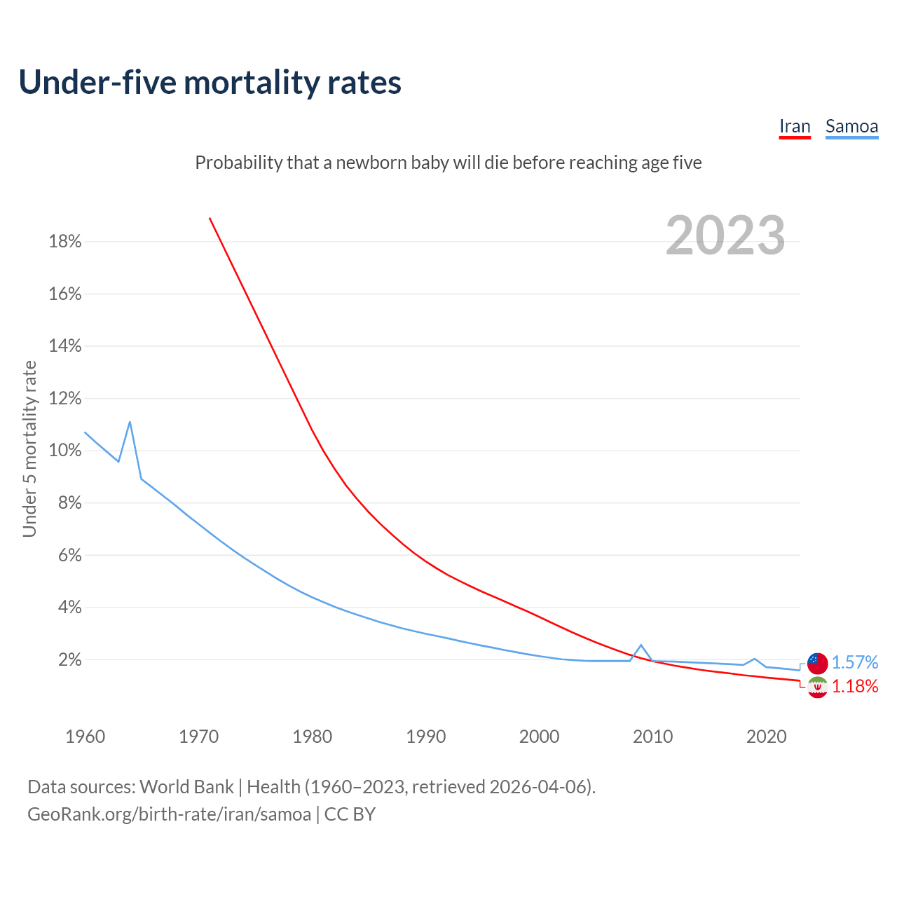 The chance that a newborn baby will die before reaching age five is 1.18% in Iran and 1.57% in Samoa. Above is a chart with historical data on under-five mortality rates.