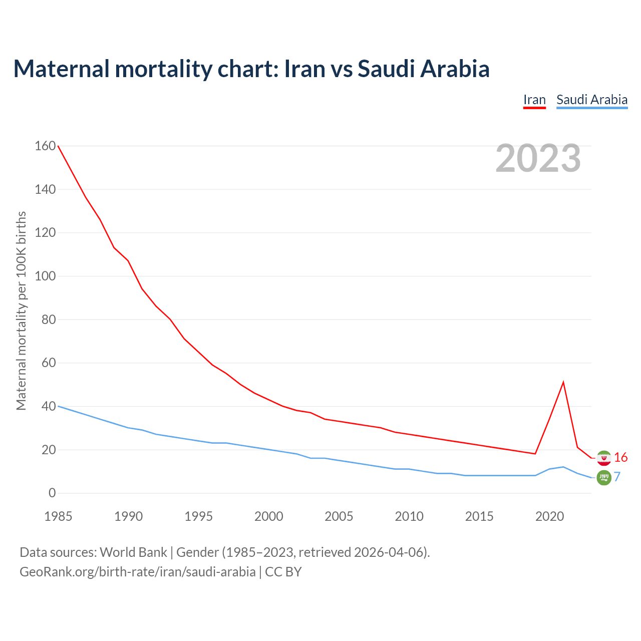 The maternal mortality rate, which is the probability of dying during childbirth or within 42 days of pregnancy termination, is 16 deaths per 100,000 live births in Iran, compared to 7 deaths in Saudi Arabia.