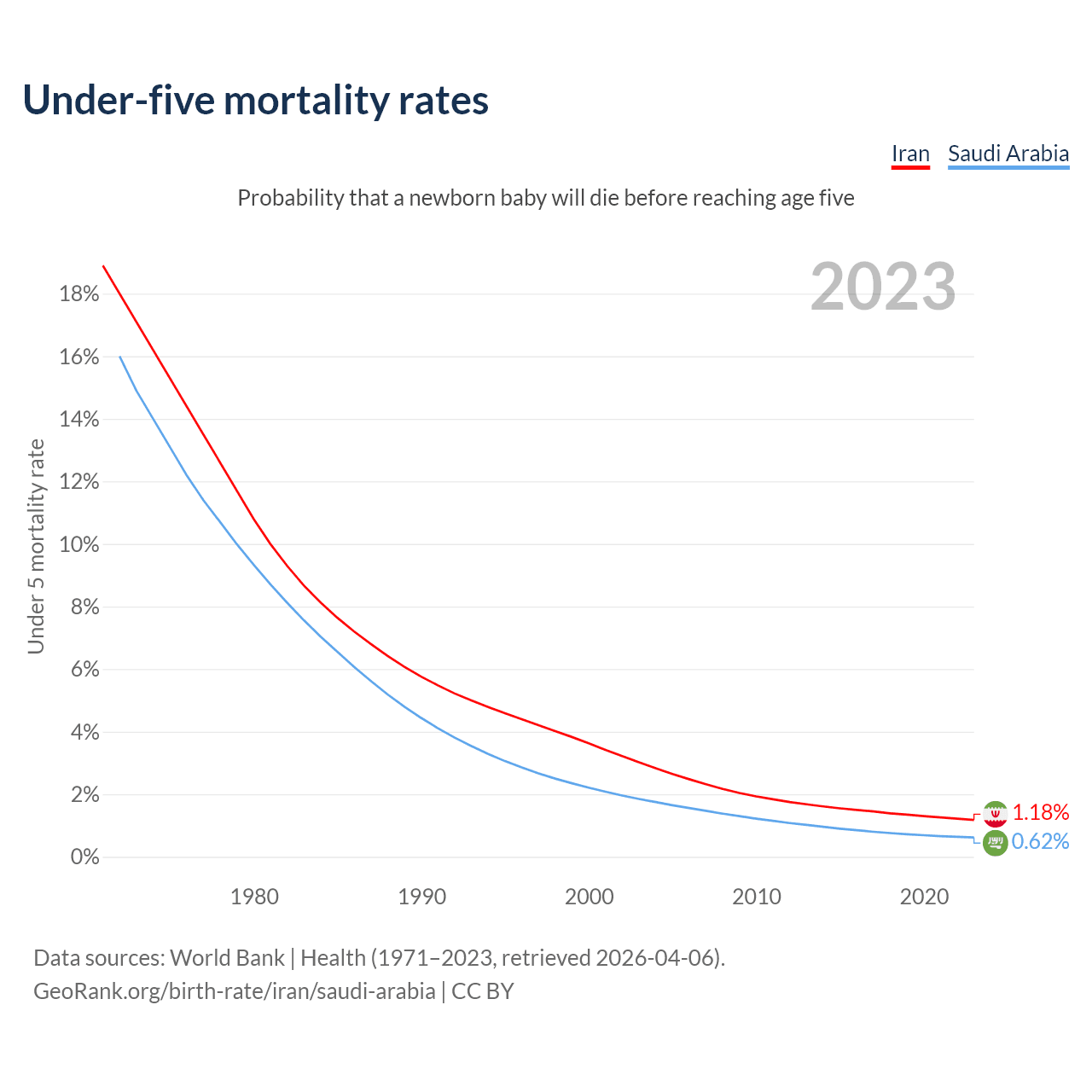The chance that a newborn baby will die before reaching age five is 1.18% in Iran and 0.62% in Saudi Arabia. Above is a chart with historical data on under-five mortality rates.