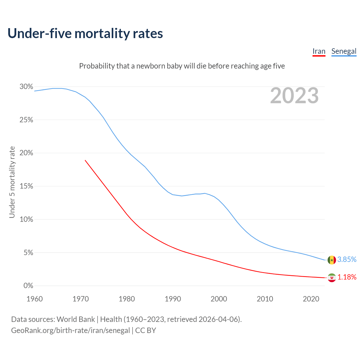 The chance that a newborn baby will die before reaching age five is 1.18% in Iran and 3.85% in Senegal. Above is a chart with historical data on under-five mortality rates.
