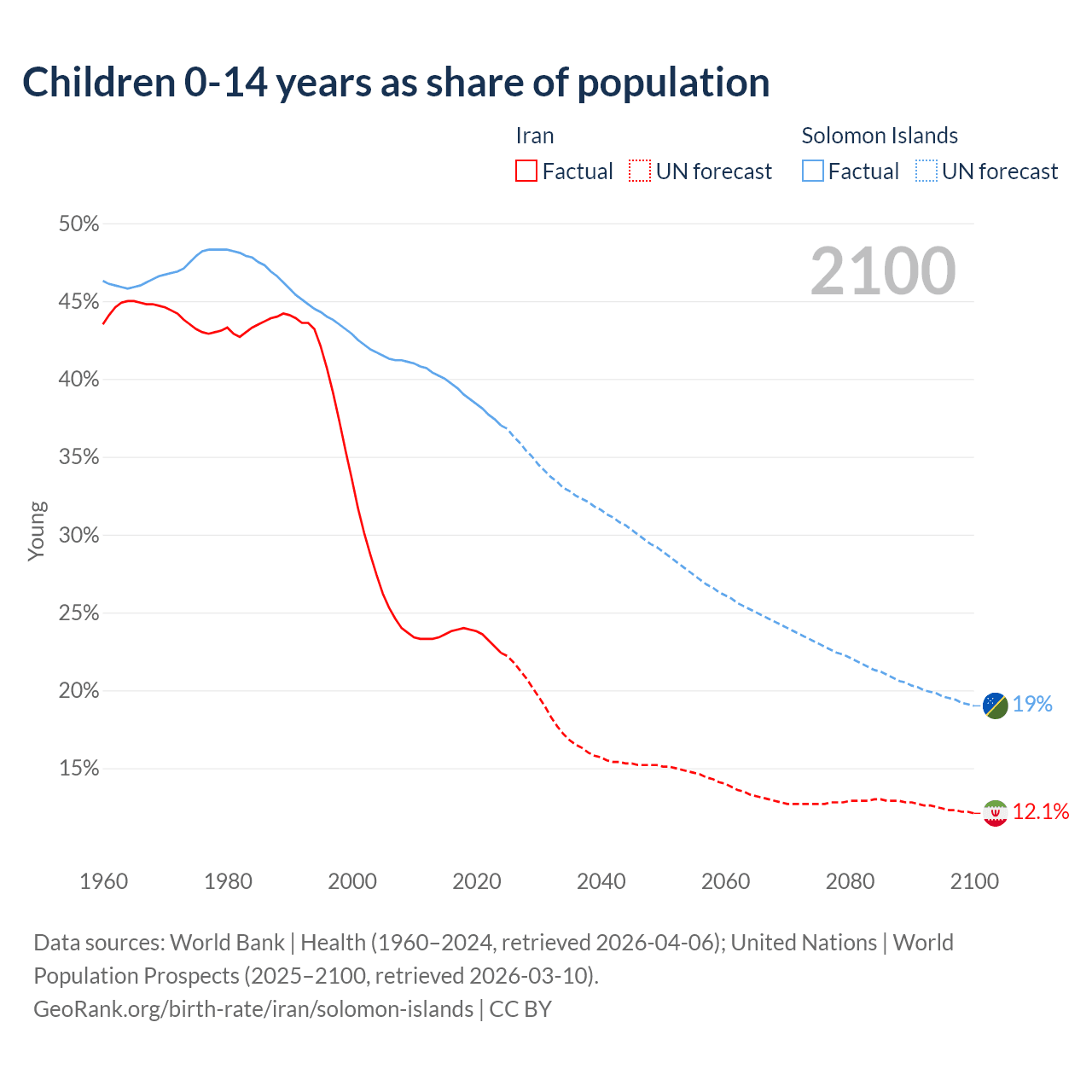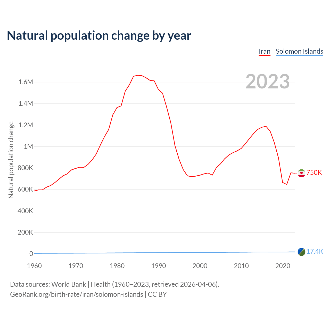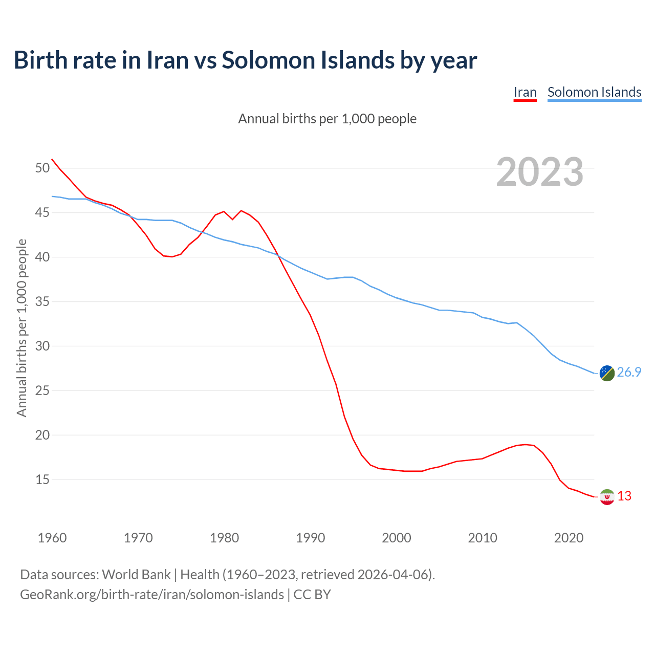 Iran has an annual birth rate of 13 births per 1,000 people, compared to 26.9 for the Solomon Islands. The average number of children a woman is expected to have during her lifetime — the fertility rate, is 1.7 in Iran and 3.56 in the Solomon Islands — 109.9% difference.