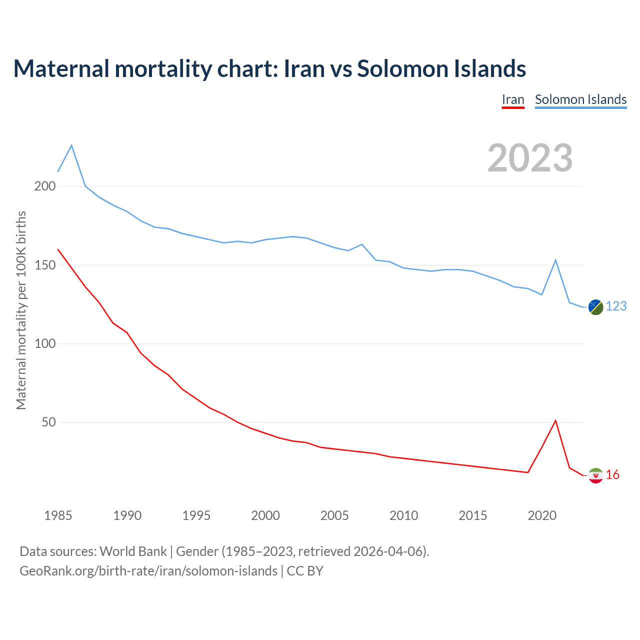 The maternal mortality rate, which is the probability of dying during childbirth or within 42 days of pregnancy termination, is 16 deaths per 100,000 live births in Iran, compared to 123 deaths in the Solomon Islands.