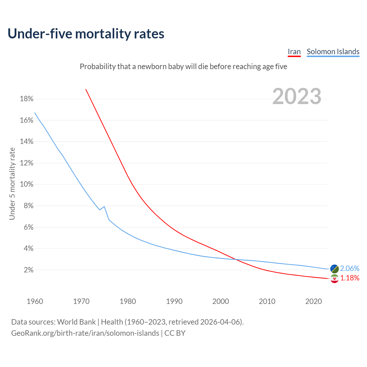 The chance that a newborn baby will die before reaching age five is 1.18% in Iran and 2.06% in the Solomon Islands. Above is a chart with historical data on under-five mortality rates.