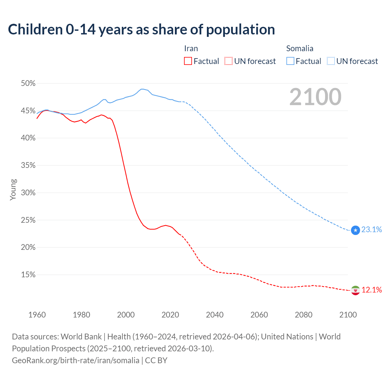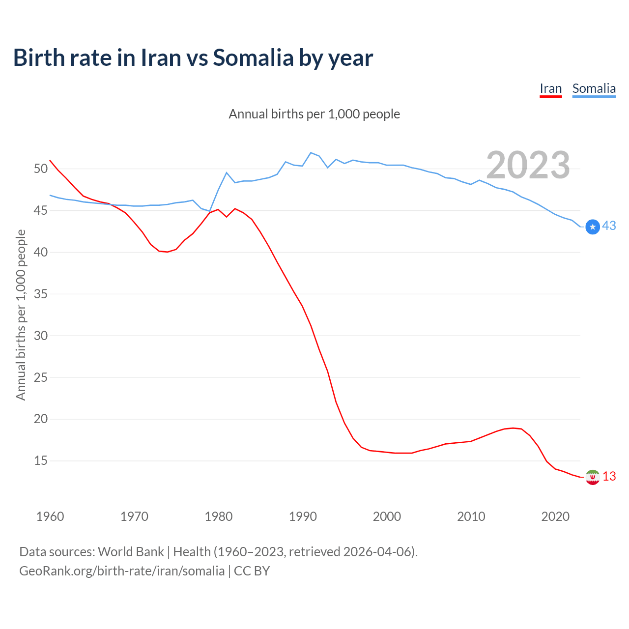 According to the latest available data on birth rates, the fertility rate in Iran was 1.7 children per woman in 2023, compared to 6.13 in Somalia in 2023. The replacement level is considered to be 2.1 children per woman.