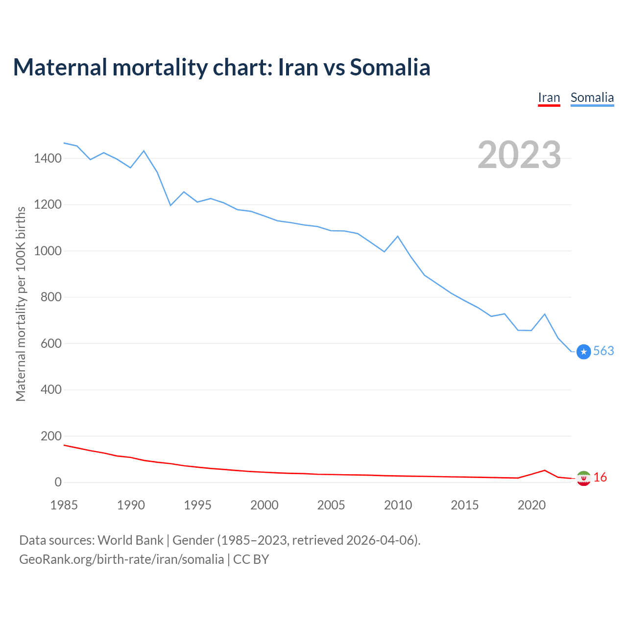The maternal mortality rate, which is the probability of dying during childbirth or within 42 days of pregnancy termination, is 16 deaths per 100,000 live births in Iran, compared to 563 deaths in Somalia.