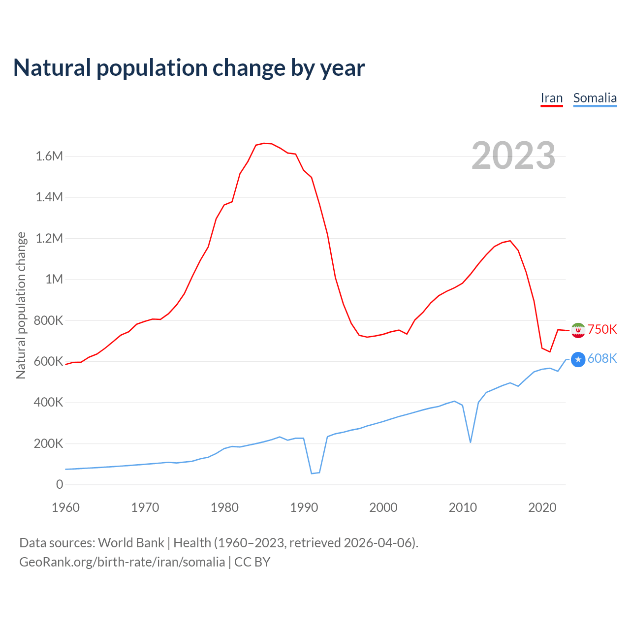 Iran has an annual birth rate of 13 births per 1,000 people, compared to 43 for Somalia. The average number of children a woman is expected to have during her lifetime — the fertility rate, is 1.7 in Iran and 6.13 in Somalia — 261.8% difference.