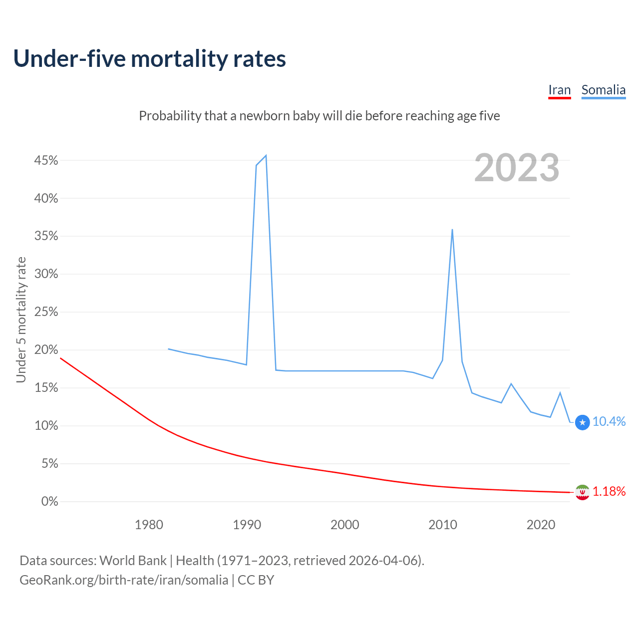 The chance that a newborn baby will die before reaching age five is 1.18% in Iran and 10.4% in Somalia. Above is a chart with historical data on under-five mortality rates.