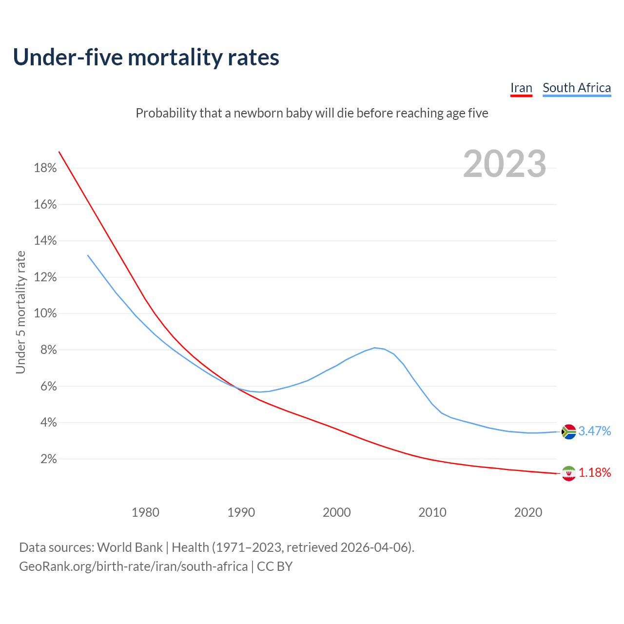 The chance that a newborn baby will die before reaching age five is 1.18% in Iran and 3.47% in South Africa. Above is a chart with historical data on under-five mortality rates.