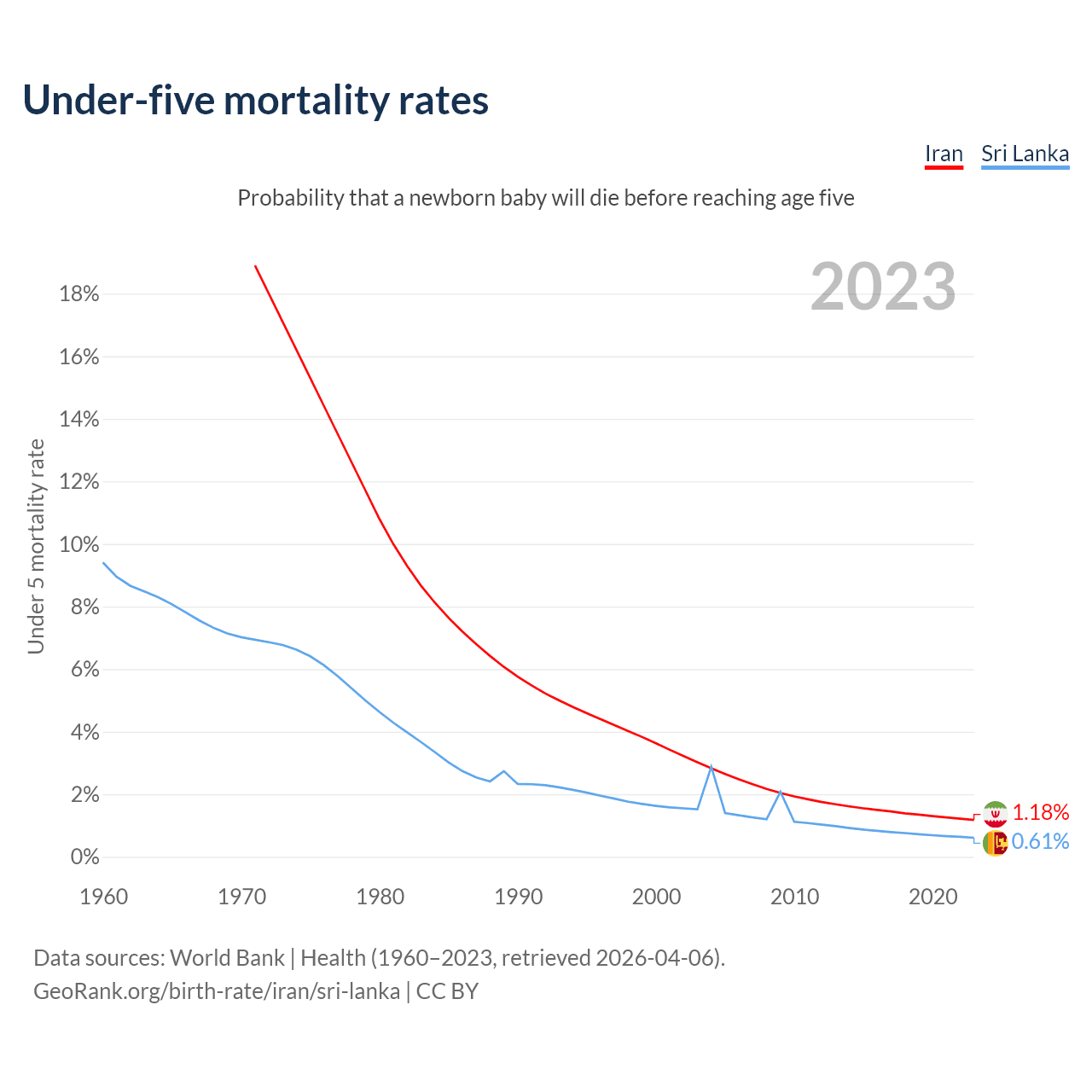 The chance that a newborn baby will die before reaching age five is 1.18% in Iran and 0.61% in Sri Lanka. Above is a chart with historical data on under-five mortality rates.