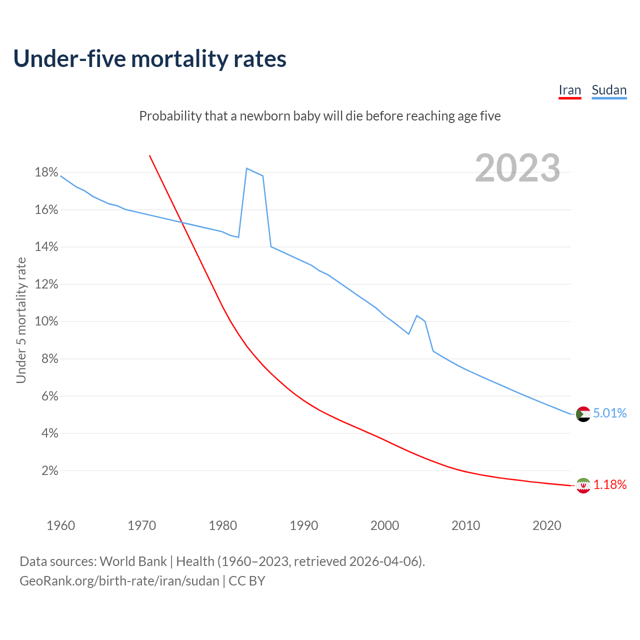 The chance that a newborn baby will die before reaching age five is 1.18% in Iran and 5.01% in Sudan. Above is a chart with historical data on under-five mortality rates.