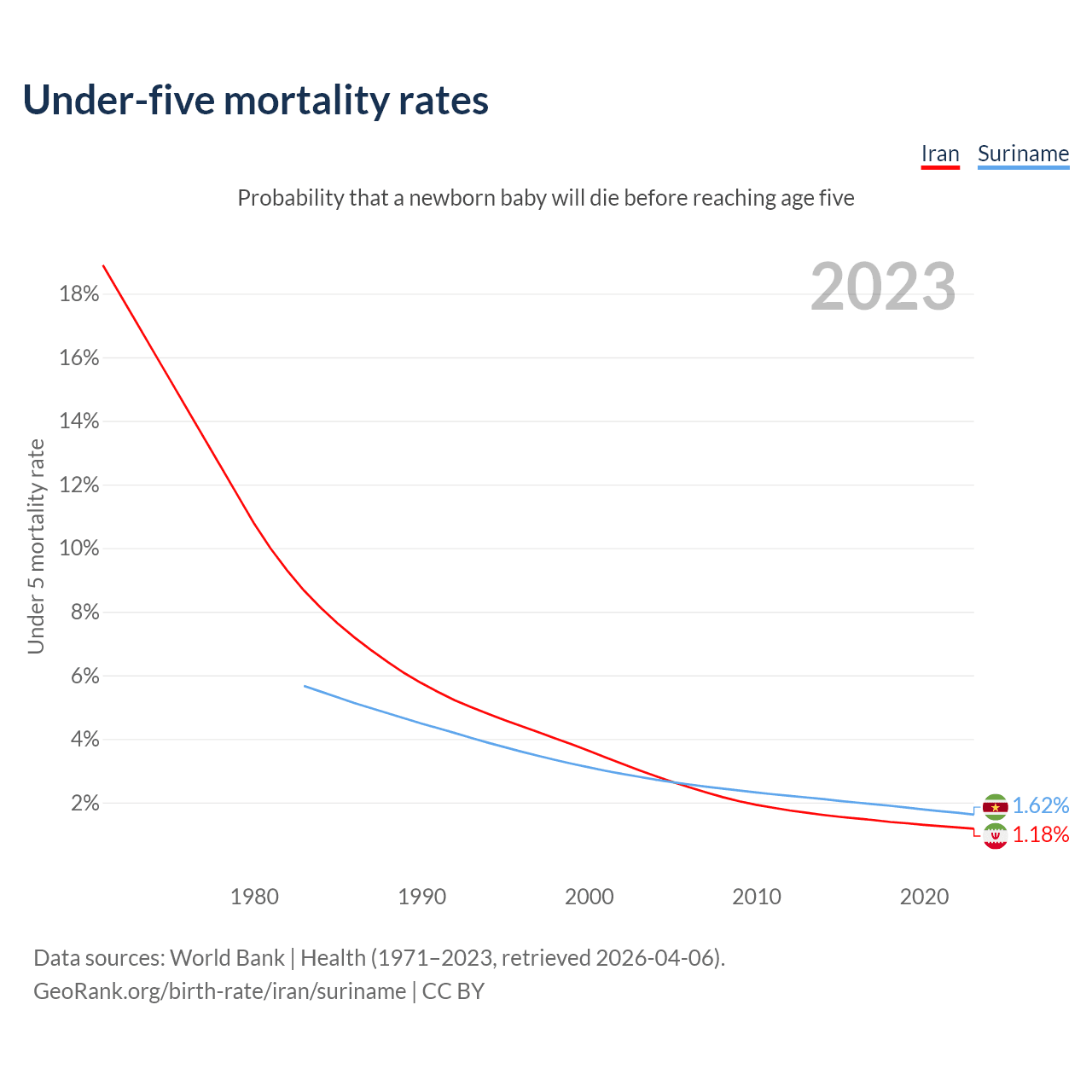 The chance that a newborn baby will die before reaching age five is 1.18% in Iran and 1.62% in Suriname. Above is a chart with historical data on under-five mortality rates.