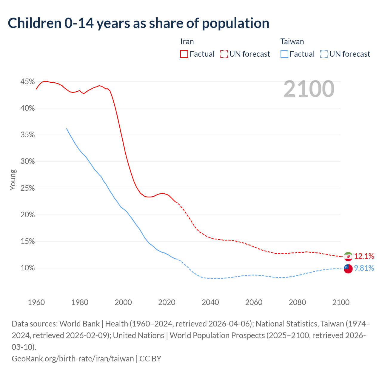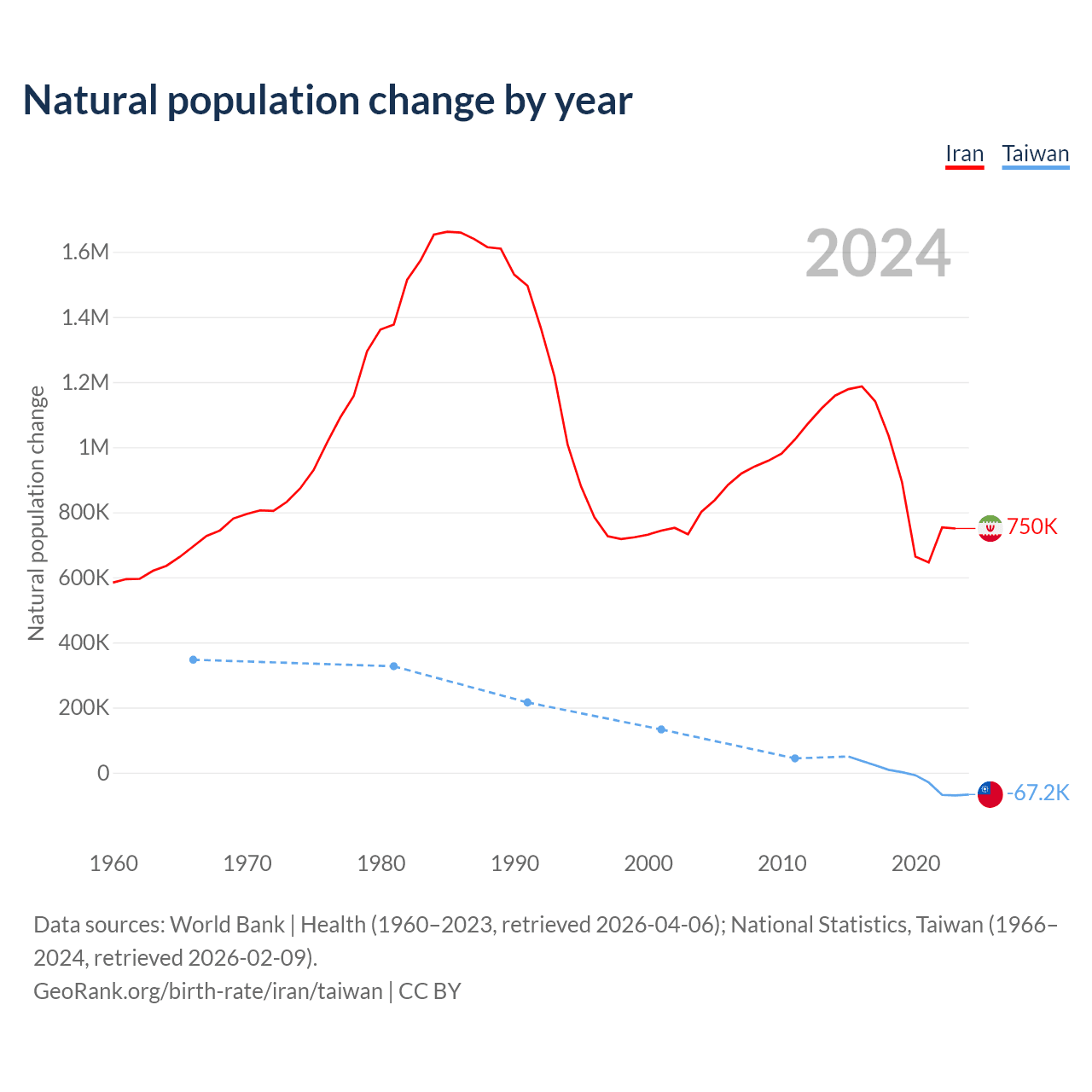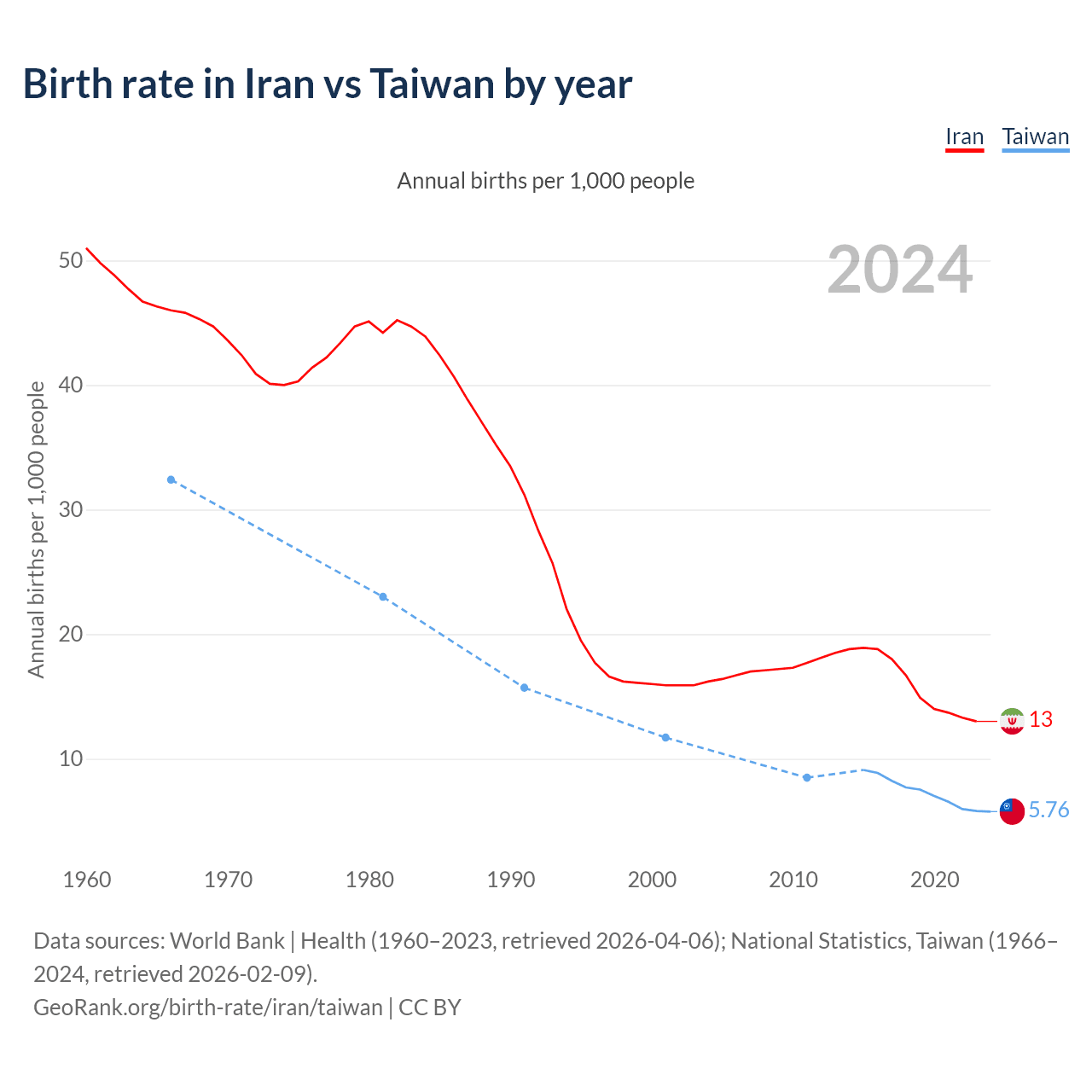 Iran has an annual birth rate of 13 births per 1,000 people, compared to 5.76 for Taiwan. The average number of children a woman is expected to have during her lifetime — the fertility rate, is 1.7 in Iran and 0.89 in Taiwan — 47.8% difference.