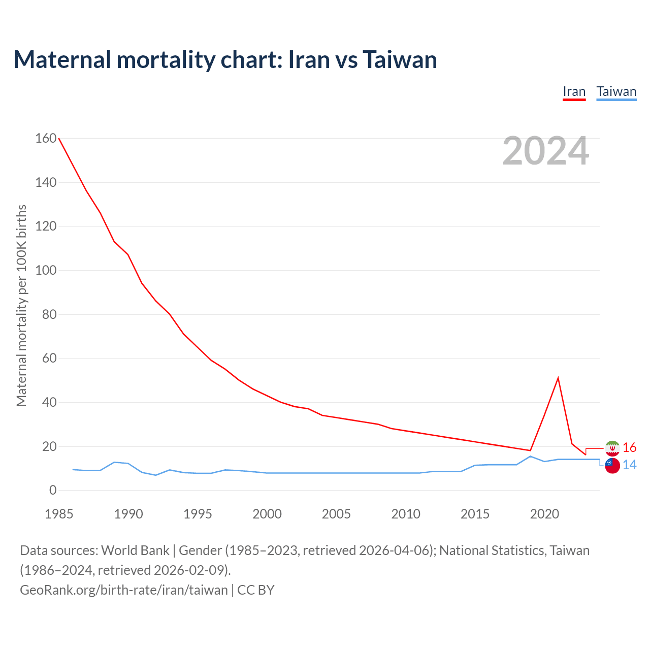 The maternal mortality rate, which is the probability of dying during childbirth or within 42 days of pregnancy termination, is 16 deaths per 100,000 live births in Iran, compared to 14 deaths in Taiwan.