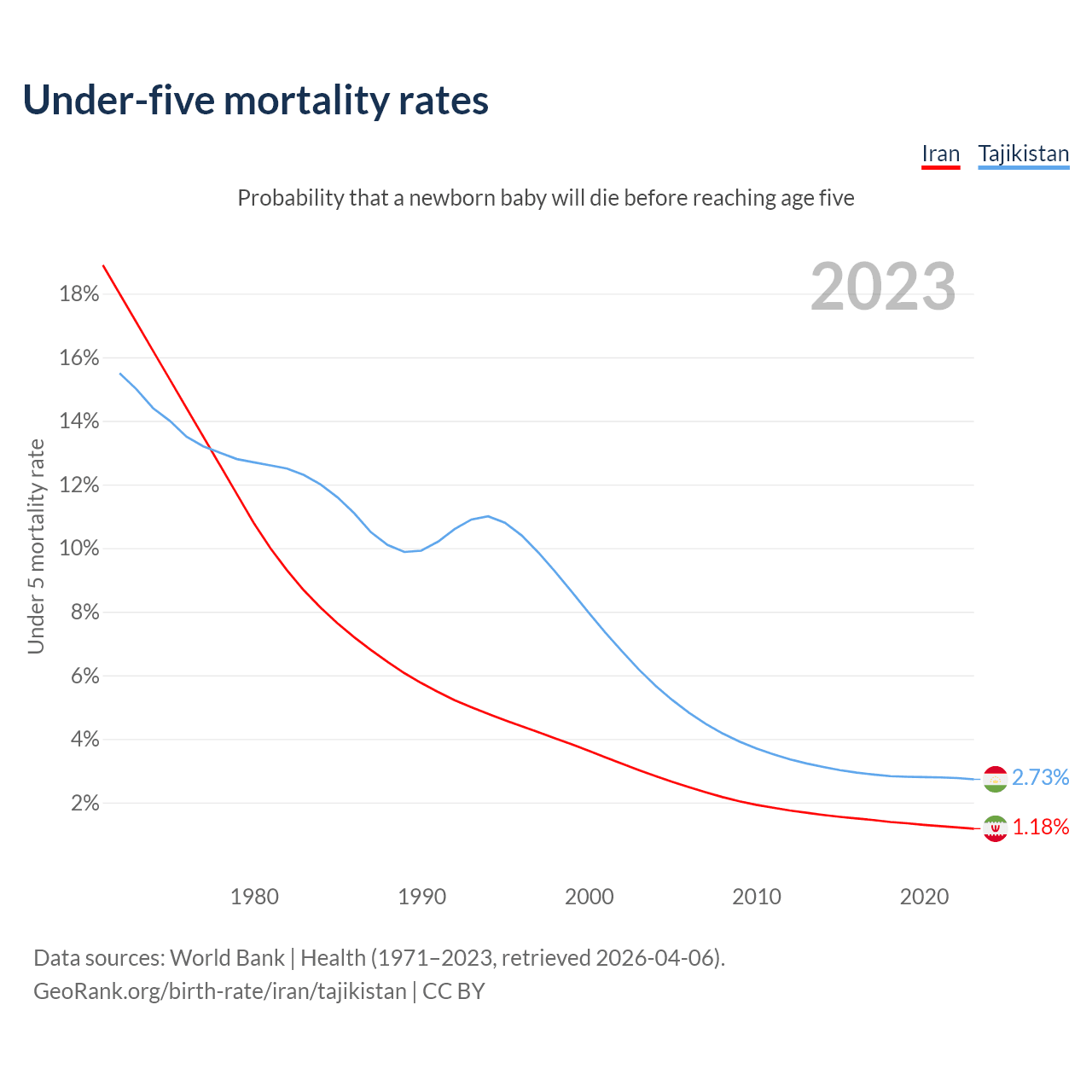 The chance that a newborn baby will die before reaching age five is 1.18% in Iran and 2.73% in Tajikistan. Above is a chart with historical data on under-five mortality rates.