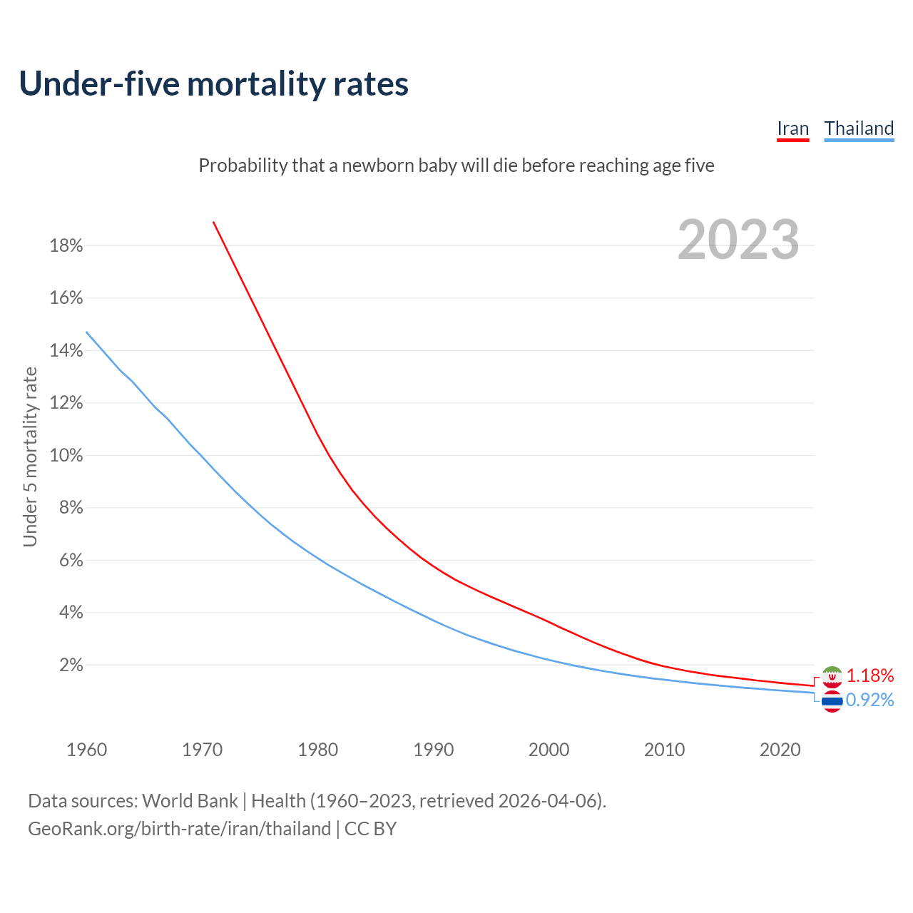 The chance that a newborn baby will die before reaching age five is 1.18% in Iran and 0.92% in Thailand. Above is a chart with historical data on under-five mortality rates.