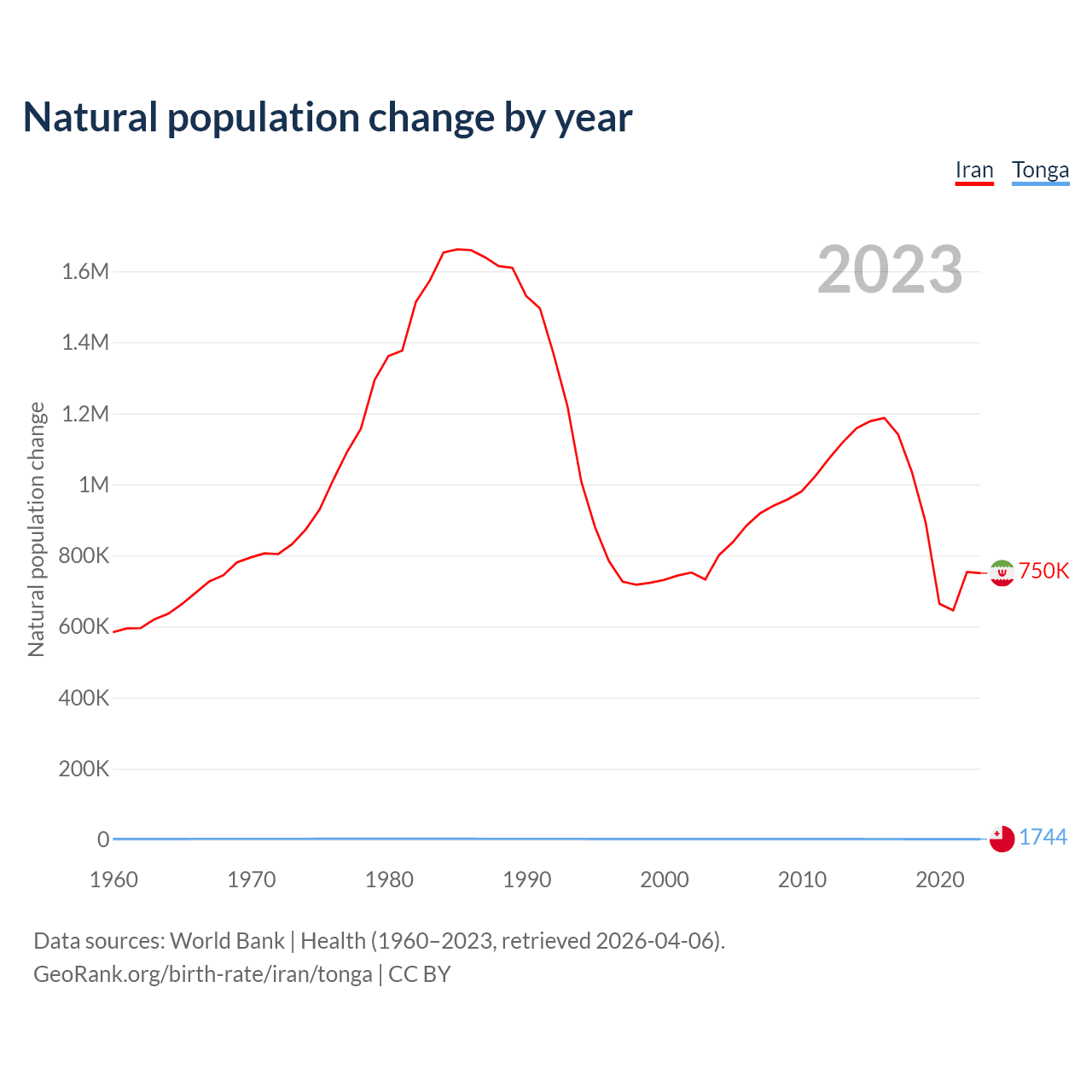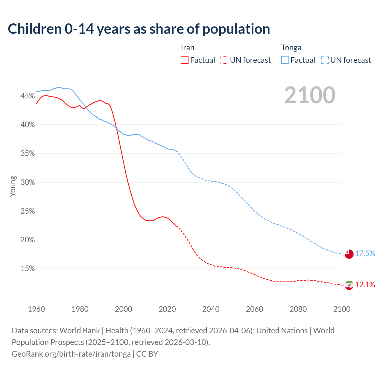 Iran has an annual birth rate of 13 births per 1,000 people, compared to 23.1 for Tonga. The average number of children a woman is expected to have during her lifetime — the fertility rate, is 1.7 in Iran and 3.13 in Tonga — 84.6% difference.