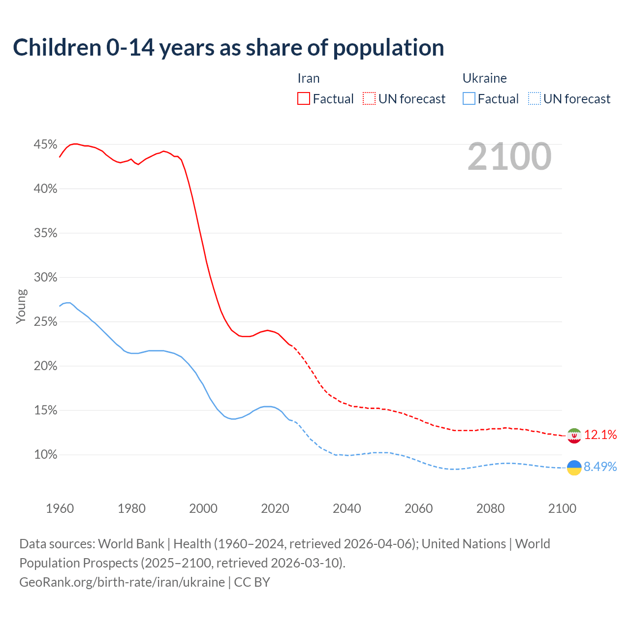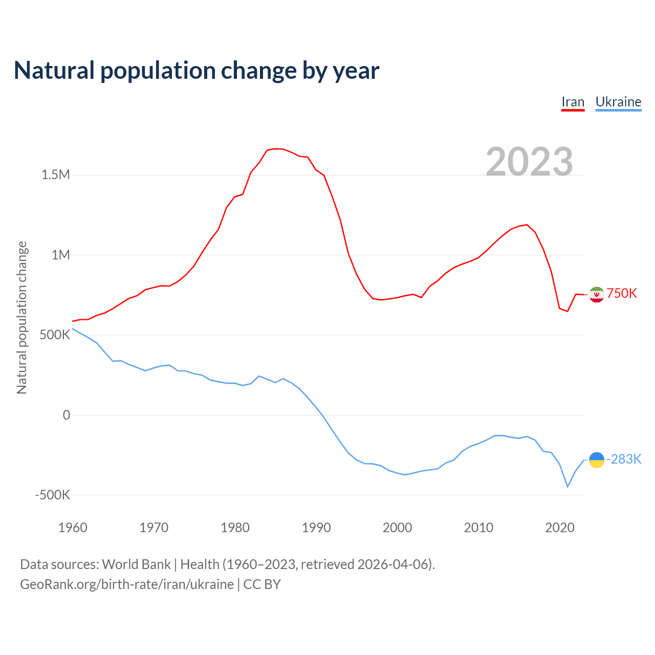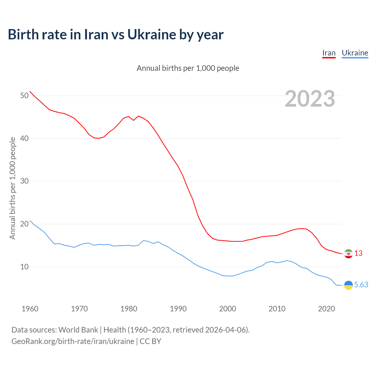 Iran has an annual birth rate of 13 births per 1,000 people, compared to 5.63 for Ukraine. The average number of children a woman is expected to have during her lifetime — the fertility rate, is 1.7 in Iran and 0.98 in Ukraine — 42.4% difference.