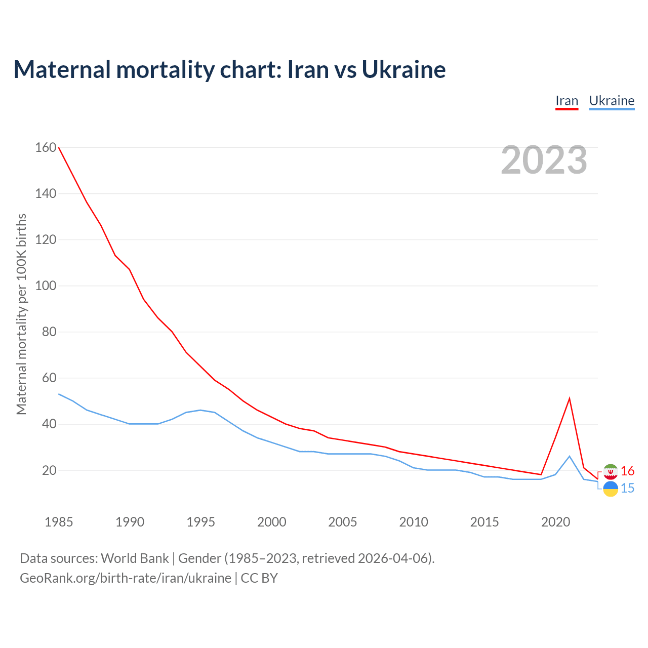 The maternal mortality rate, which is the probability of dying during childbirth or within 42 days of pregnancy termination, is 16 deaths per 100,000 live births in Iran, compared to 15 deaths in Ukraine.