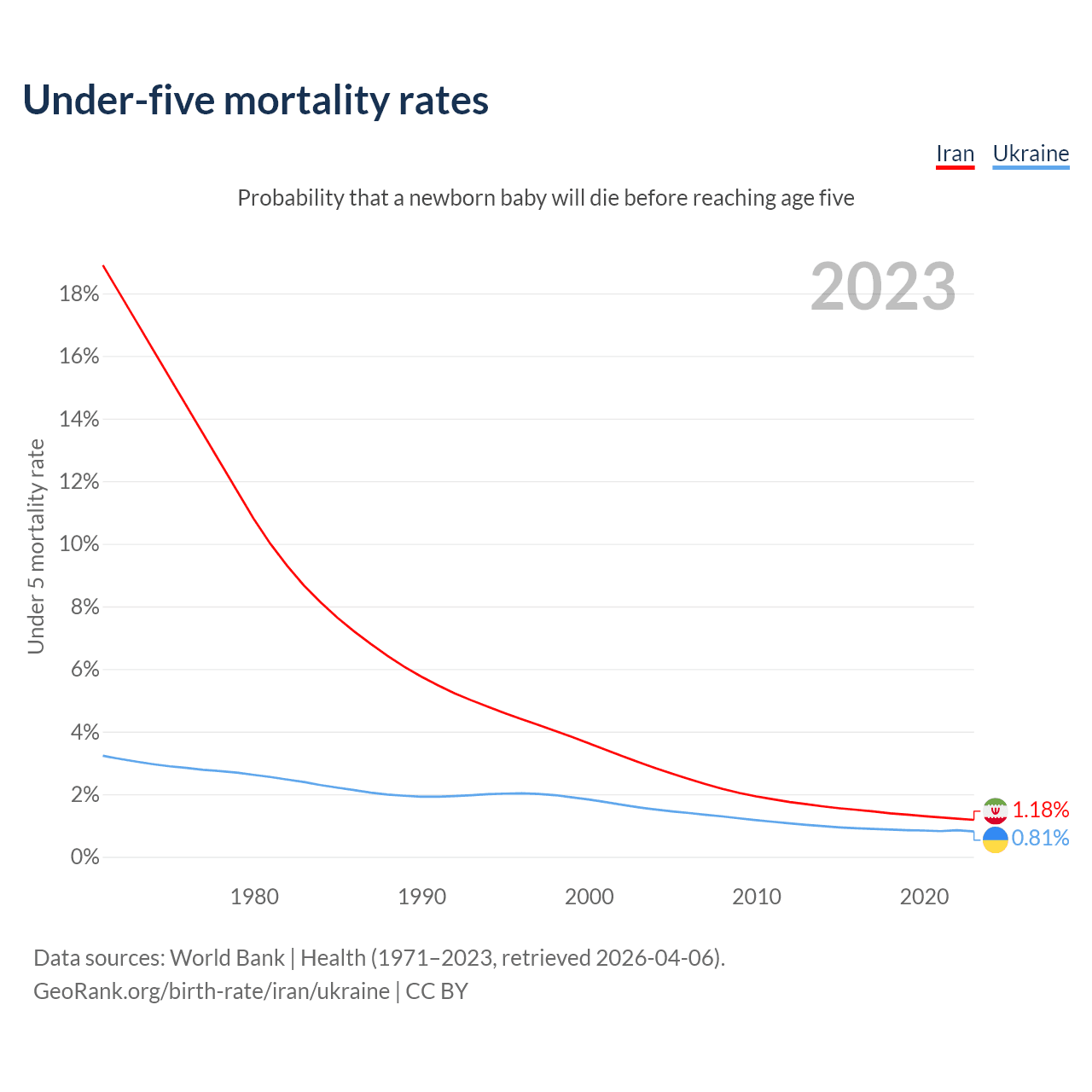 The chance that a newborn baby will die before reaching age five is 1.18% in Iran and 0.81% in Ukraine. Above is a chart with historical data on under-five mortality rates.