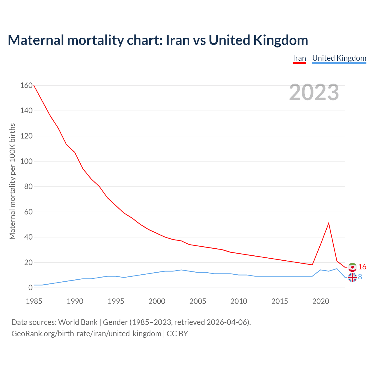 The maternal mortality rate, which is the probability of dying during childbirth or within 42 days of pregnancy termination, is 16 deaths per 100,000 live births in Iran, compared to 8 deaths in the United Kingdom.
