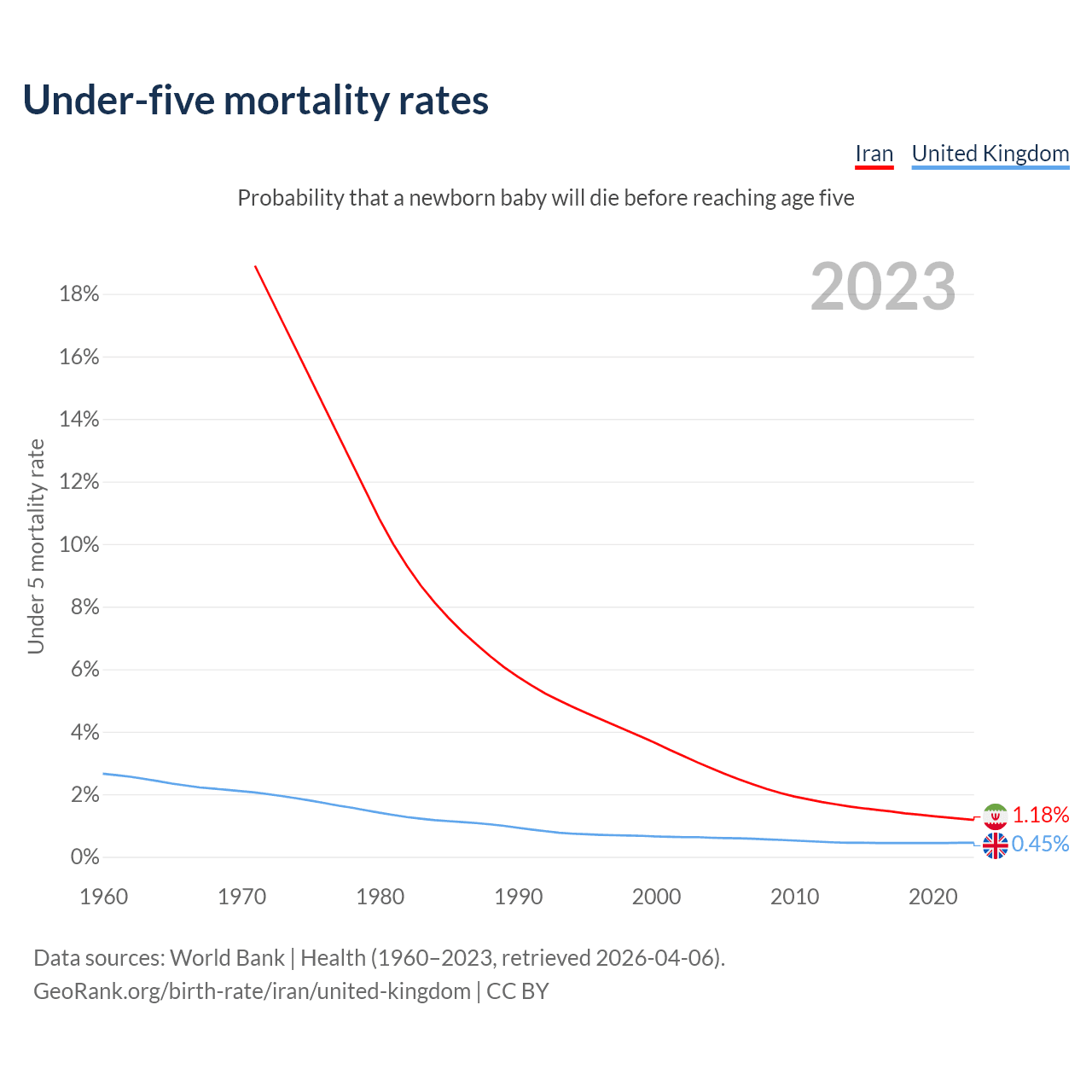 The chance that a newborn baby will die before reaching age five is 1.18% in Iran and 0.45% in the United Kingdom. Above is a chart with historical data on under-five mortality rates.