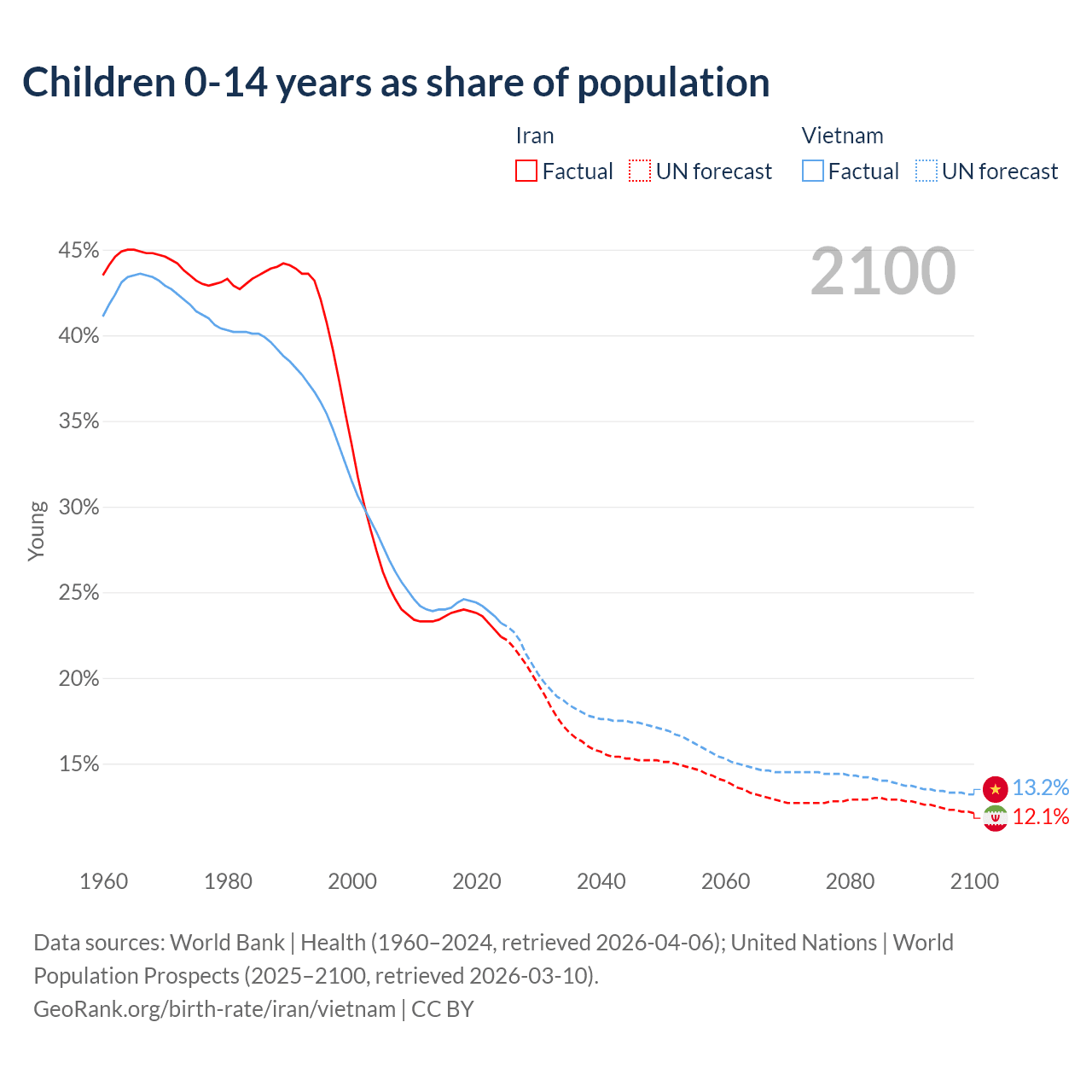 Iran has an annual birth rate of 13 births per 1,000 people, compared to 13.8 for Vietnam. The average number of children a woman is expected to have during her lifetime — the fertility rate, is 1.7 in Iran and 1.91 in Vietnam — 12.9% difference.