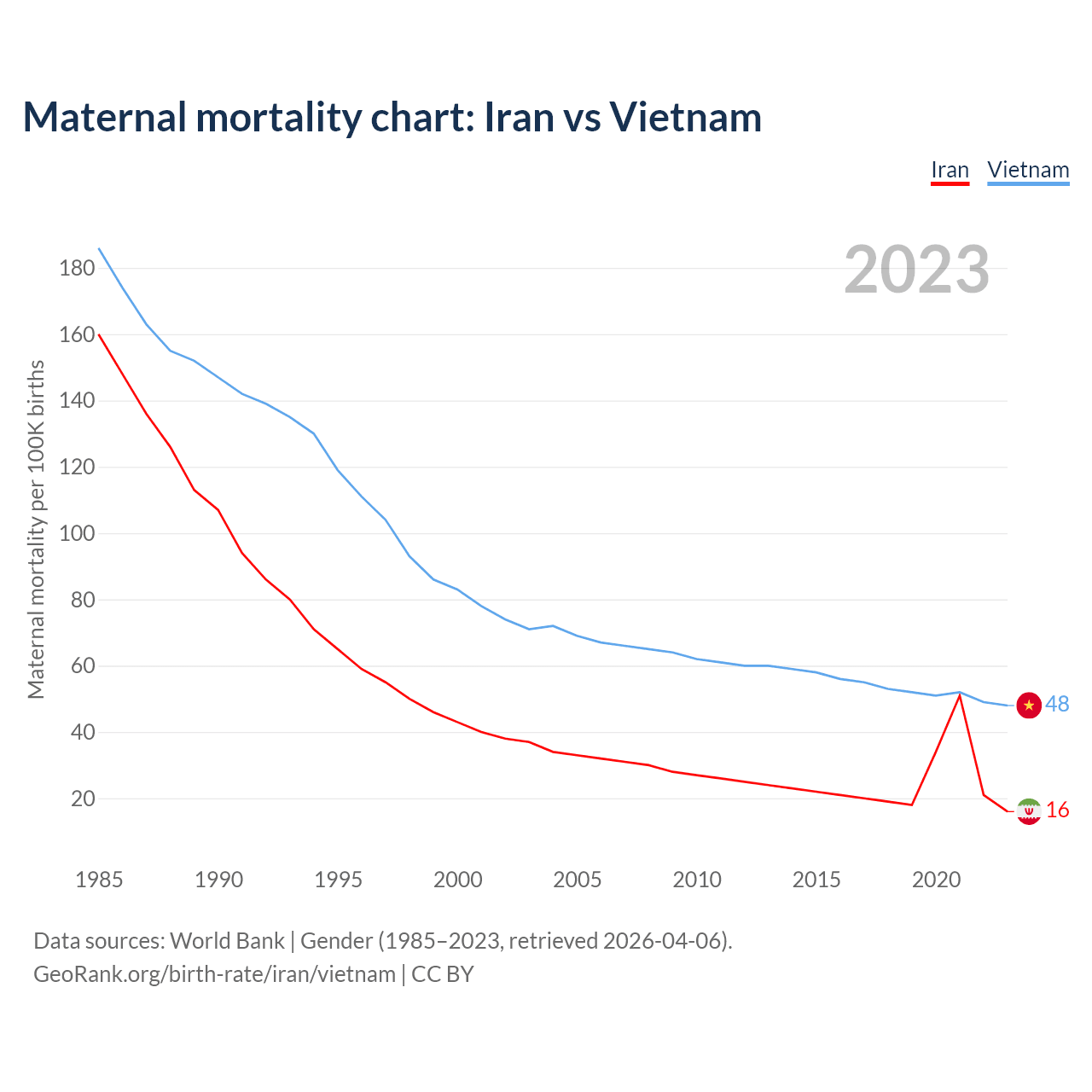 The maternal mortality rate, which is the probability of dying during childbirth or within 42 days of pregnancy termination, is 16 deaths per 100,000 live births in Iran, compared to 48 deaths in Vietnam.