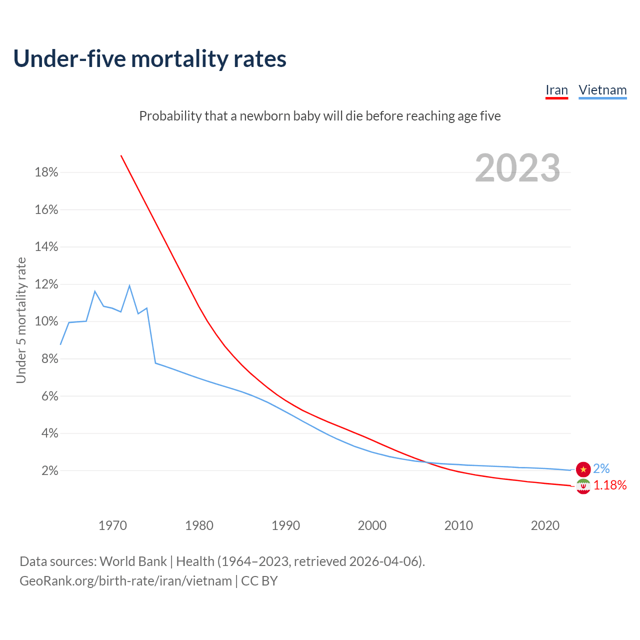 The chance that a newborn baby will die before reaching age five is 1.18% in Iran and 2% in Vietnam. Above is a chart with historical data on under-five mortality rates.