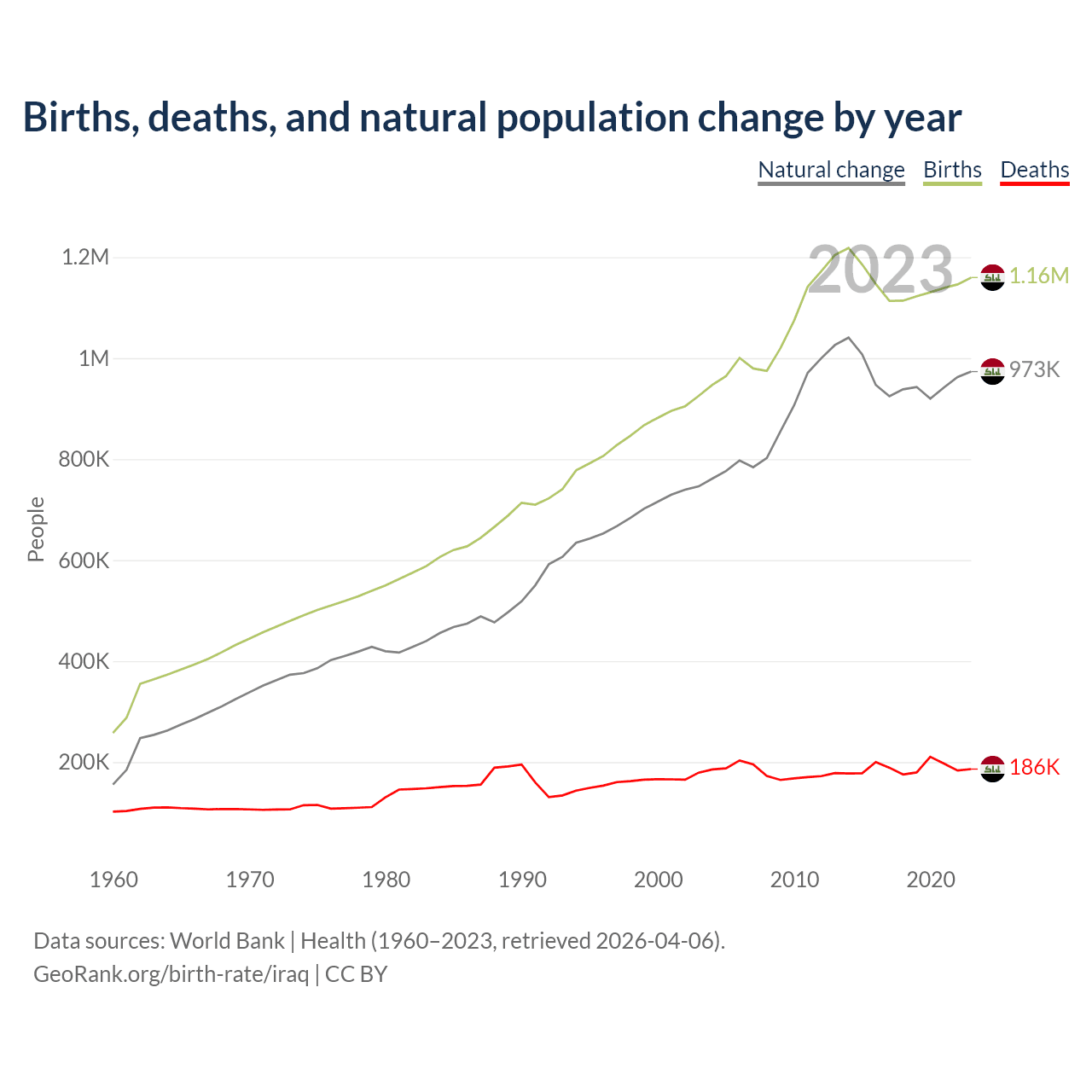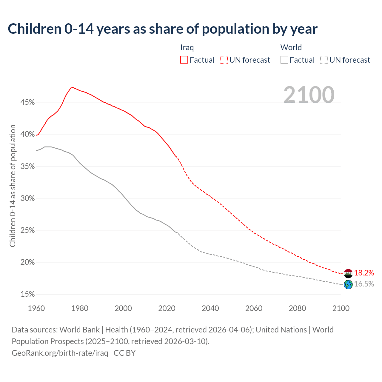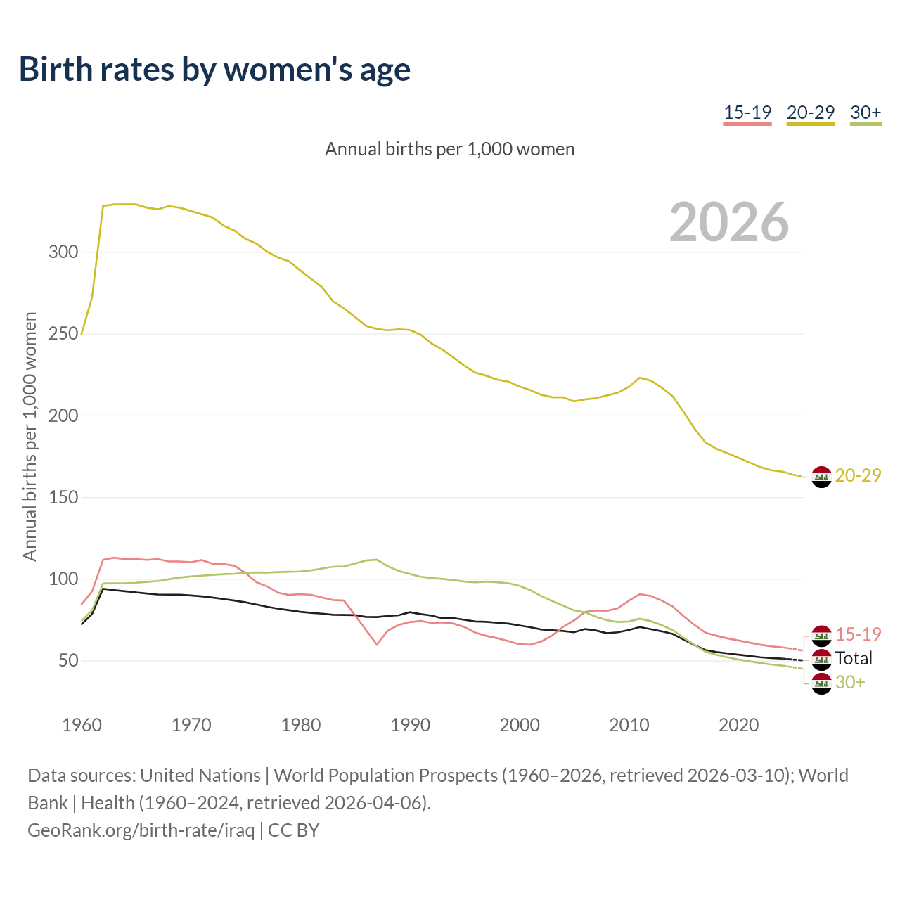 Iraq has a birth rate of 25.7 (annual births per 1,000 people) and a fertility rate of 3.25 (the average number of children a woman is expected to have over her lifetime based on current age-specific birth rates).