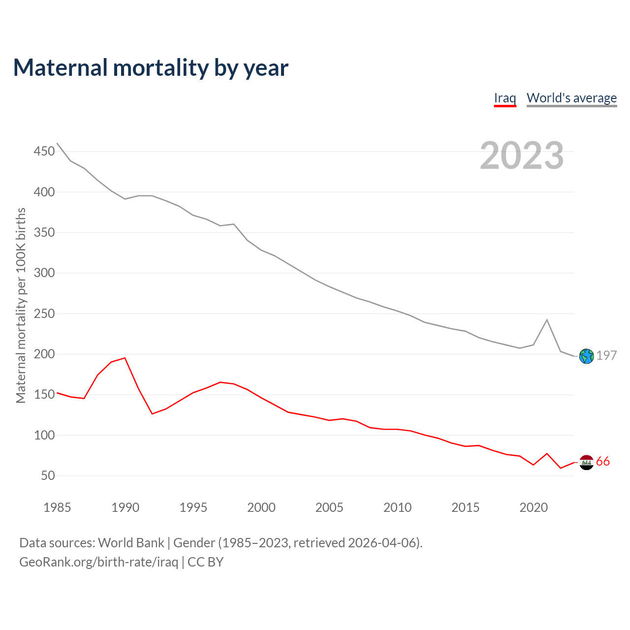 The maternal mortality rate in Iraq was 66 deaths per 100,000 live births in 2023 — a 0.07% chance of dying during childbirth or within 42 days of pregnancy termination. This is a 54.8% decrease compared to the year 2000.