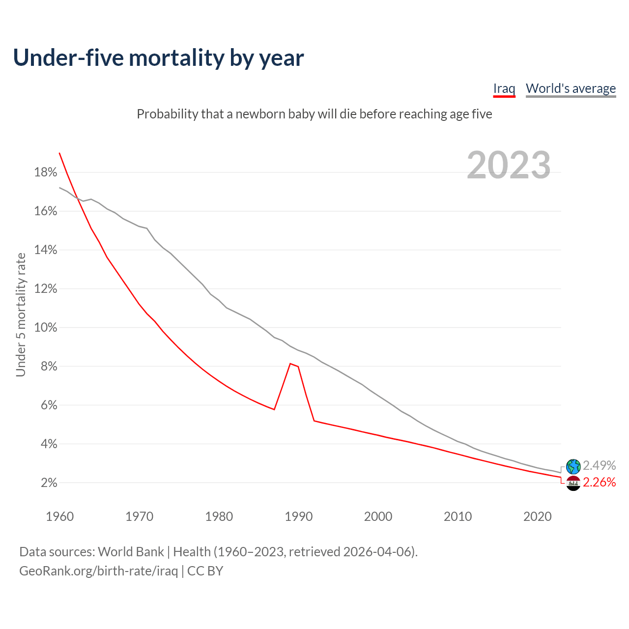 The under-5 mortality rate in Iraq was 22.6 deaths per 1,000 live births in 2023 — a 2.26% chance that a newborn baby will die before reaching age five. This is down from 44.3 deaths per 1,000 live births in 2000.