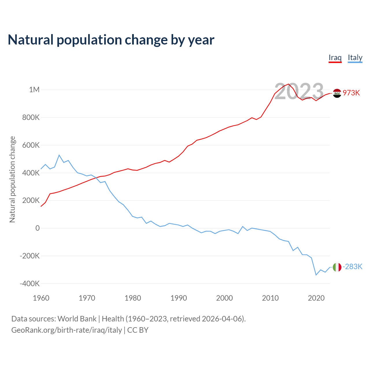 According to the latest available data on birth rates, the fertility rate in Iraq was 3.25 children per woman in 2023, compared to 1.2 in Italy in 2023. The replacement level is considered to be 2.1 children per woman.