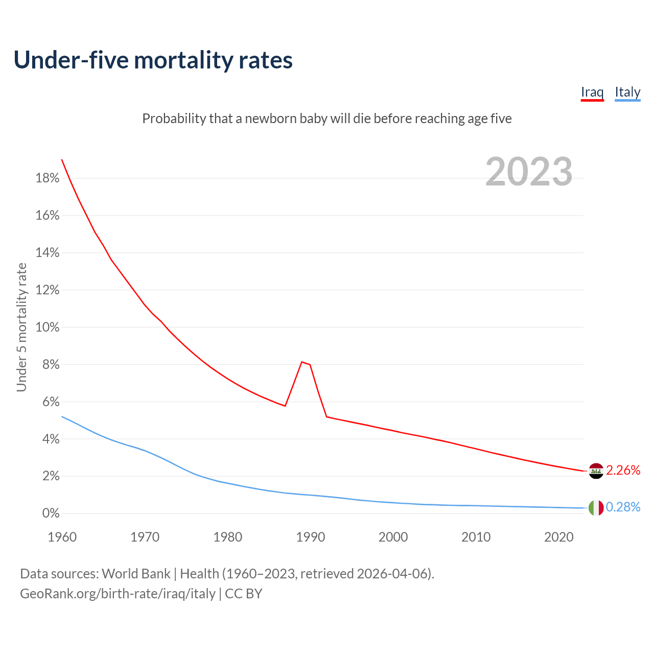 The chance that a newborn baby will die before reaching age five is 2.26% in Iraq and 0.28% in Italy. Above is a chart with historical data on under-five mortality rates.