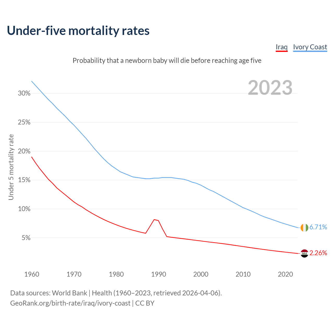 The chance that a newborn baby will die before reaching age five is 2.26% in Iraq and 6.71% in Ivory Coast. Above is a chart with historical data on under-five mortality rates.