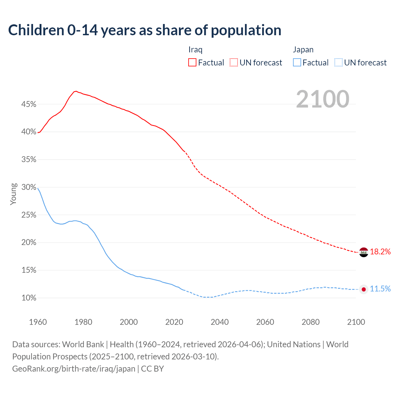 Iraq has an annual birth rate of 25.7 births per 1,000 people, compared to 6 for Japan. The average number of children a woman is expected to have during her lifetime — the fertility rate, is 3.25 in Iraq and 1.2 in Japan — 63.1% difference.