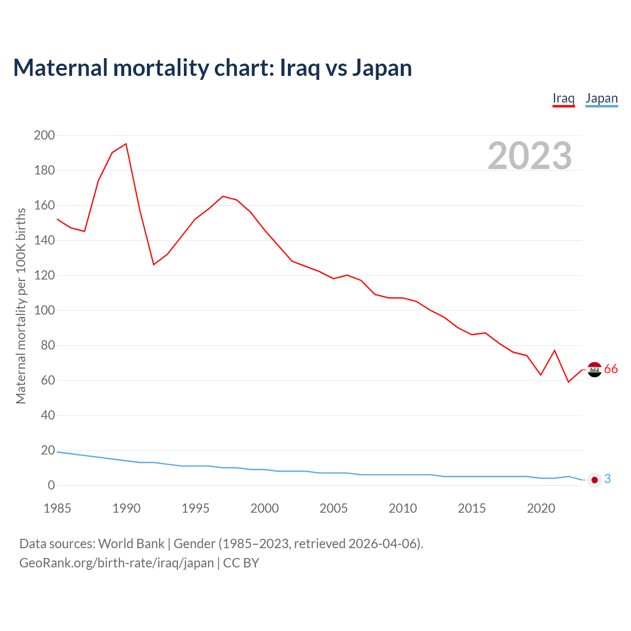 The maternal mortality rate, which is the probability of dying during childbirth or within 42 days of pregnancy termination, is 66 deaths per 100,000 live births in Iraq, compared to 3 deaths in Japan.