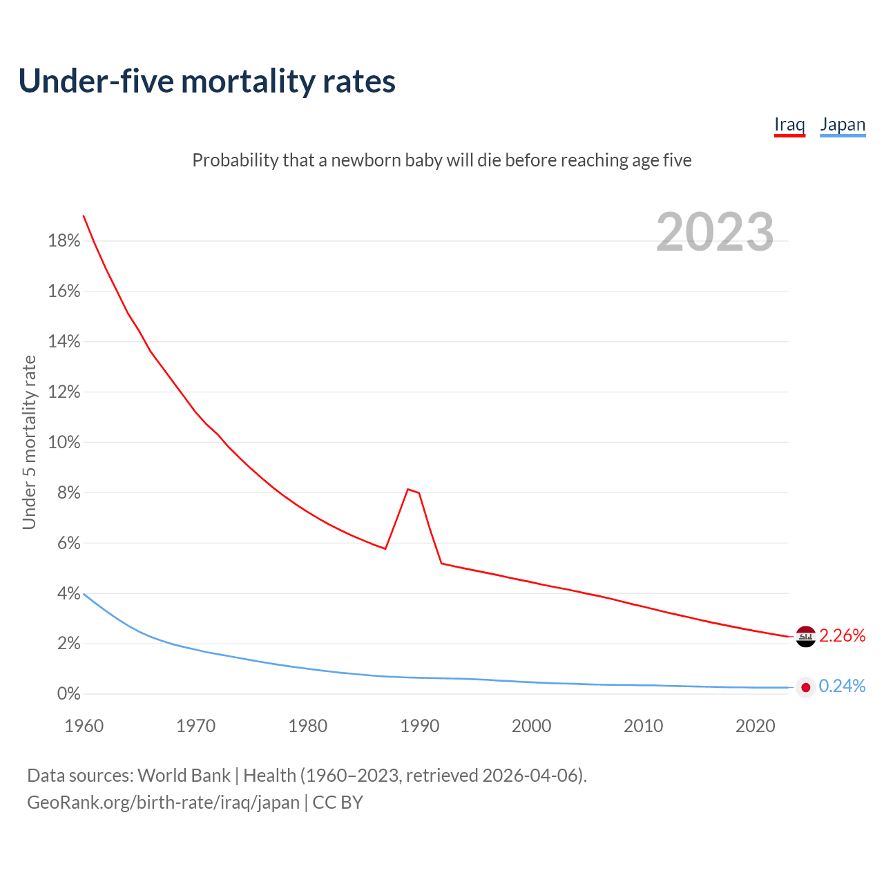 The chance that a newborn baby will die before reaching age five is 2.26% in Iraq and 0.24% in Japan. Above is a chart with historical data on under-five mortality rates.